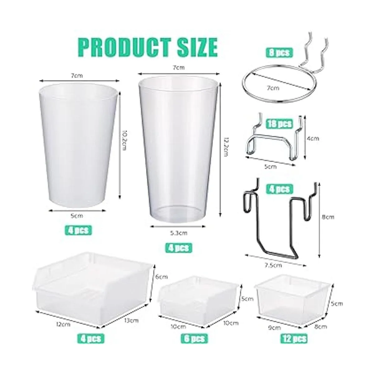 Diversos tamaños: recibirás 4 tazas de tablero de clavijas de 3.35 a 2.36 pulgadas de profundidad x 4.72 pulgadas de alto y 4 tazas de tablero de clavijas de 2.7 a 1.8 pulgadas de profundidad x 4 pulgadas de alto, 22 piezas de contenedores de tablero de clavijas en diferentes tamaños, es decir, 3.54 x 3.15 x 1.777777 pulgadas de largo x 1 pulgadas de ancho x altura, 3. 94 x 3.94 x 1.97 pulgadas largo x ancho x alto, 5 x 5.5 x 2.5 pulgadas largo x ancho x alto, junto con ganchos de metal en tablero de clavijas de bucle de 3.35 pulgadas y 2 pulgadas, el diverso tamaño y cantidad suficiente para satisfacer tus diversas necesidades; Nota: el tablero de clavijas no está incluido