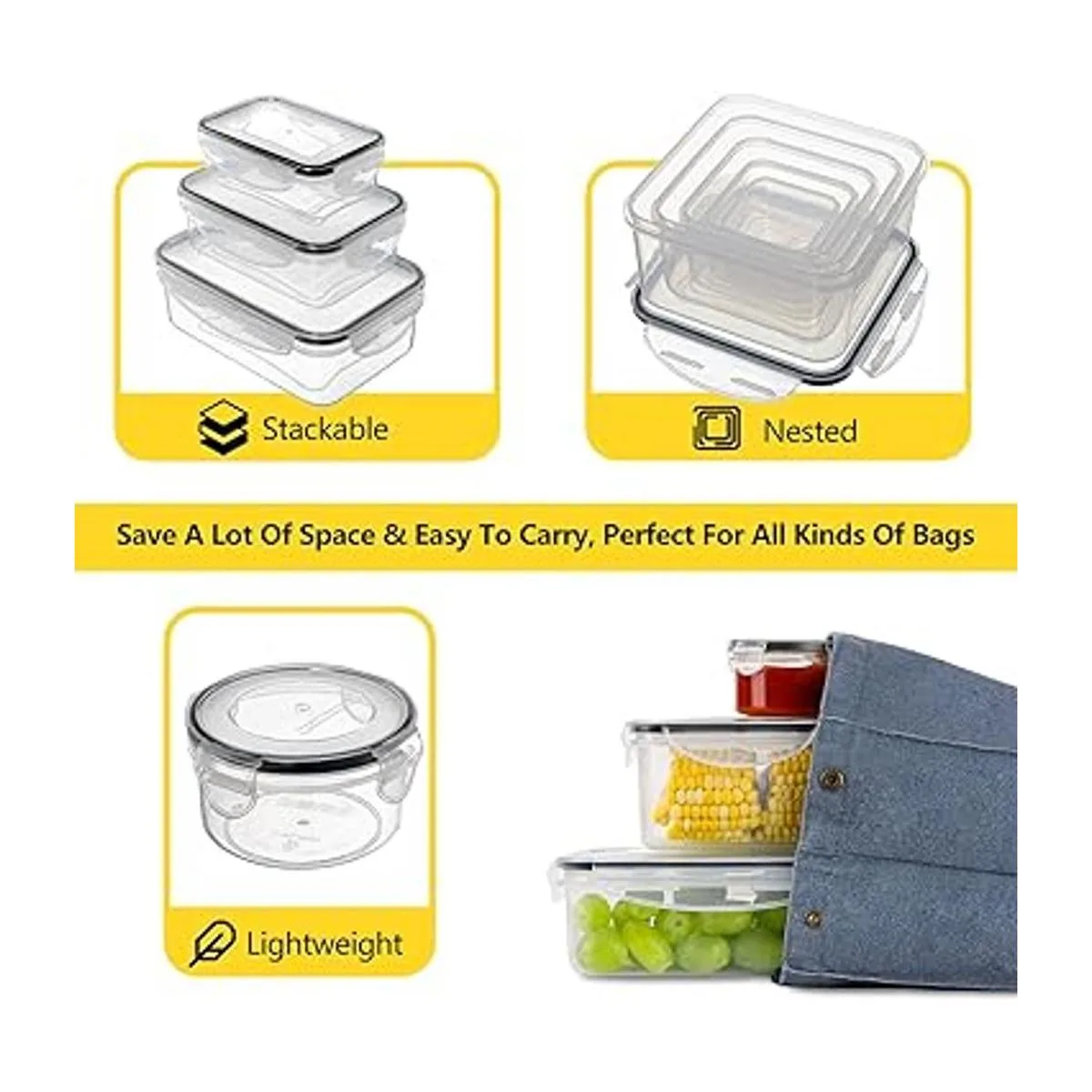 Diseño mejorado: estos recipientes de almacenamiento de alimentos con tapas adoptan un diseño mejorado en cada detalle: el bloqueo grueso está diseñado con bordes redondeados, más ergonómico, fácil de abrir y cerrar para usar; la parte inferior elevada es resistente al desgaste, antideslizante y segura; el diseño apilable y anidado ayuda a ahorrar mucho espacio; ligero, fácil de llevar, perfecto para todo tipo de bolsas
