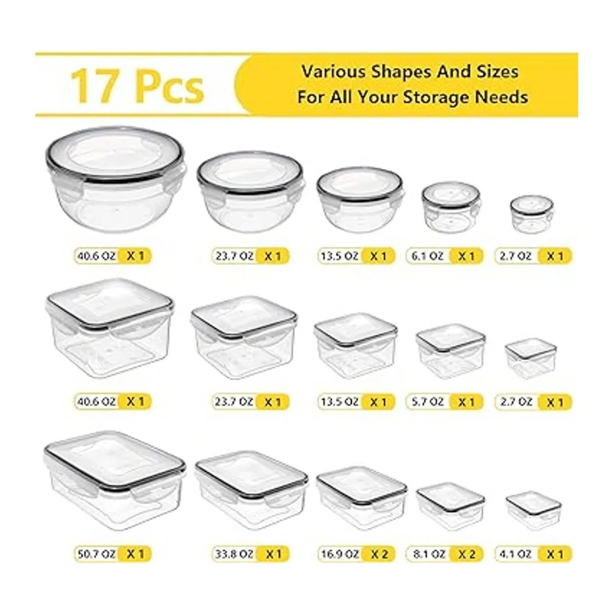 Varias formas y tamaños: recibirás 17 recipientes herméticos de almacenamiento de alimentos en tres formas y varios tamaños. Recipiente rectangular: 1 x 500 onzas, 1 x 34 onzas, 2 x 17 onzas, 2 x 8 onzas, 1 x 4 onzas, recipientes redondos: 1 x 40 onzas, 1 x 23 onzas, 1 x 13 onzas, 1 x 6 onzas, 1 x 2.7 OZ, recipientes cuadrados: 1 x 1.2 L 40 onzas, 1 x 0.7 L 23 onzas, 1 x 0.4 L 13 onzas, 1 x 0.2 L 6 onzas, 1 x 0.08 L 2.7 onzas