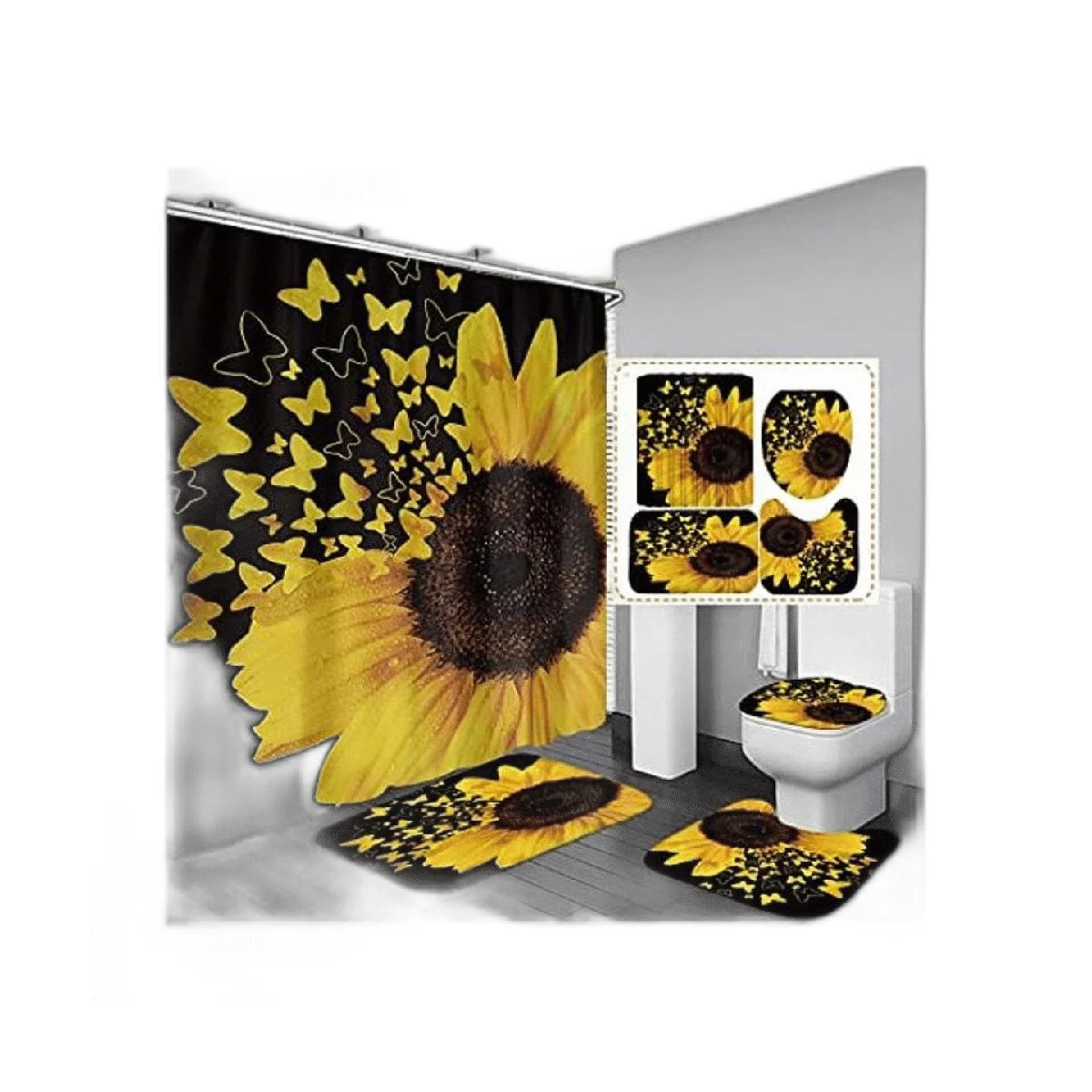 Juego de 4 cortinas de ducha con alfombras, juego de baño con diseño de girasol, accesorios de decoración, cortinas de baño, juego de ducha incluye cortina de ducha, alfombra antideslizante, cubierta de tapa de inodoro, tapete de baño y 12 ganchos