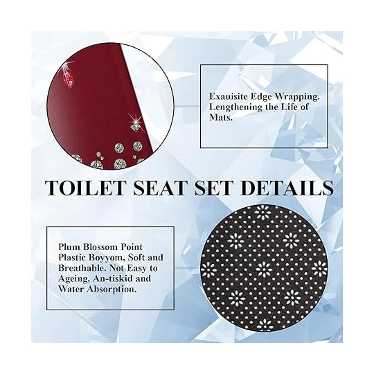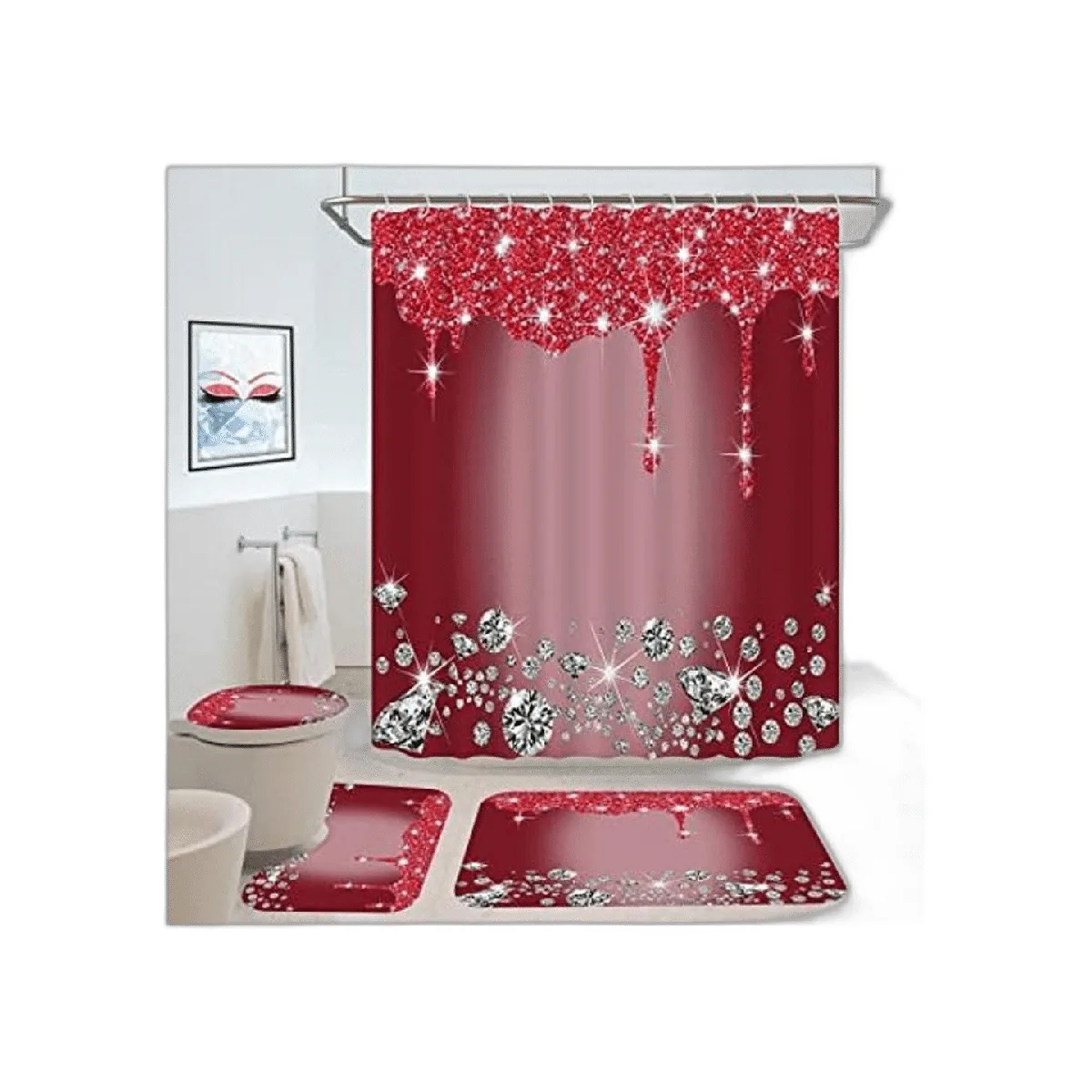 Juego de 4 cortinas de ducha con diamantes brillantes, decoración de baño con alfombras y tapa de inodoro, color rojo vino, textura de lujo, colorido brillante y moderno, con 12 ganchos, 72 x 72 pulgadas