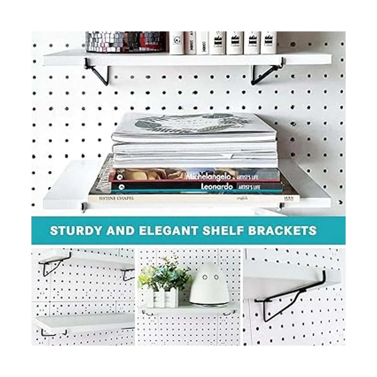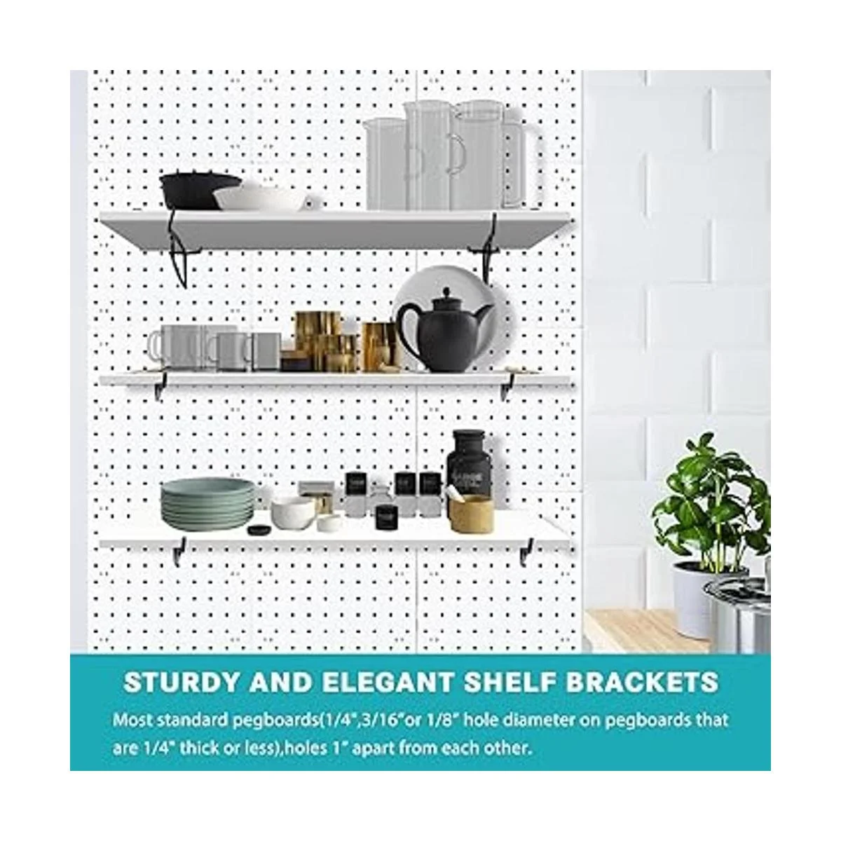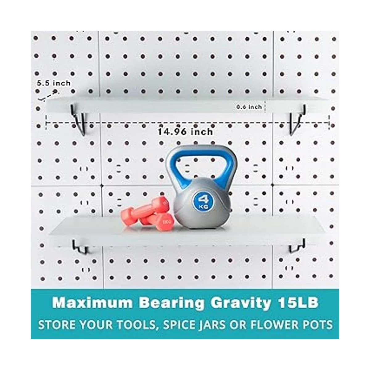 Accesorio organizador de gran capacidad Te preocupa que no haya lugar para almacenar tus herramientas El estante de tablero de clavijas apoyado por dos ganchos de estante de tablero de clavijas te proporciona una manera eficaz de mejorar la eficiencia del espacio de almacenamiento. Estos juegos de accesorios multiusos para tablero de clavijas se pueden organizar en un estilo compacto, sostiene fácilmente una variedad de herramientas, tarros de especias, libros, coleccionables y mucho más. Se puede evitar el problema de insuficiente espacio del artículo.