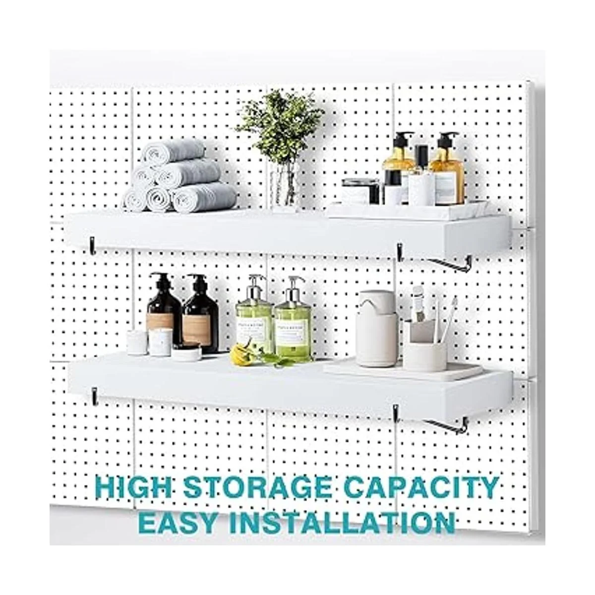 Juego de estantes de tablero de clavijas de material robusto Los estantes de madera blanca y los soportes de tablero de clavijas de acero negro combinan perfectamente, asegurando un soporte plano para artículos pesados. El estante resistente para tablero de clavijas es lo suficientemente fuerte como para soportar hasta 15 libras. Los ganchos de metal de alta calidad no se deforman fácilmente y no se oxidan, asegurando que el soporte de objetos pesados esté equilibrado y no se incline.