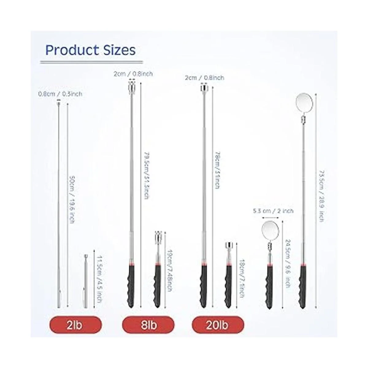 Combinación completa: obtendrás 4 piezas de herramientas de recogida de imán telescópico, incluyendo 2 piezas de barras de imán en 2.0 lbs y 19.8 lbs, 1 pieza de barra magnética de 7.9 lbs con luz LED y 1 pieza de espejo de inspección telescópico, el diseño de combinación completa satisfará tus diversas necesidades en la vida cotidiana, te dará mucha comodidad