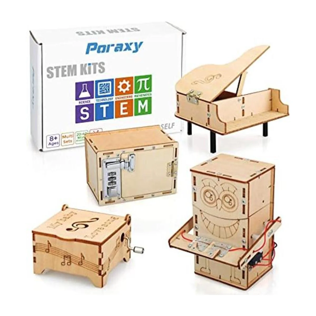 Juego de 4 juegos de STEM, kits de construcción de madera, proyectos STEM para niños de 8 a 12 años, rompecabezas 3D, juguete de modelo educativo, regalos para niños y niñas de 8, 9, 10, 11, 12 años, caja de música, Robo