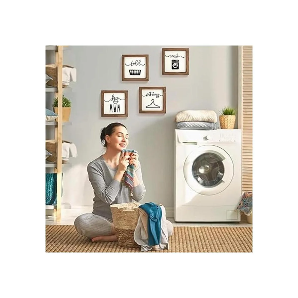 Decoración de lavandería de granja: este juego de 4 letreros de lavandería con palabras e imágenes para lavar secar plegar guardar puede animar una lavandería monótona. Estos letreros de madera para la decoración de la pared hacen que las tareas aburridas sean fáciles y divertidas.