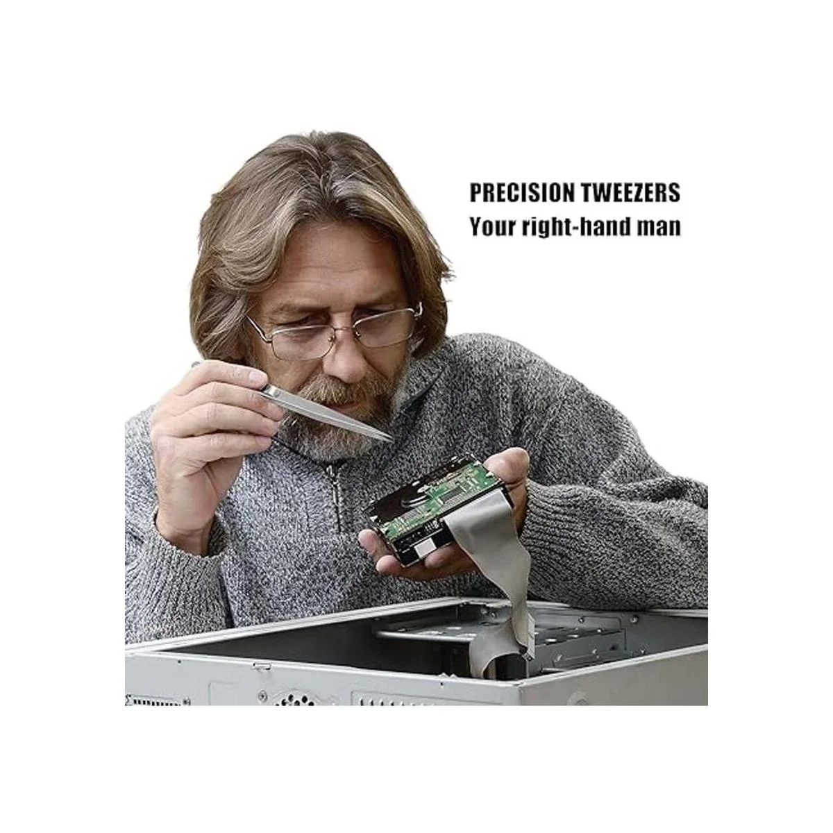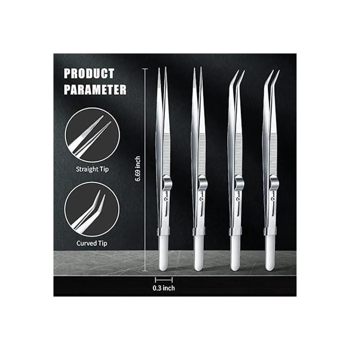 Cantidad adecuada: recibirás 2 pinzas electrónicas rectas de punta fina y 2 pinzas de punta curva con cerradura, cada una mide aproximadamente 6.69 pulgadas de longitud, cantidad adecuada y suficiente para satisfacer tus necesidades diarias y reemplazo, que se puede aplicar para el mantenimiento de componentes eléctricos, artesanía de joyería, sala de limpieza, etc