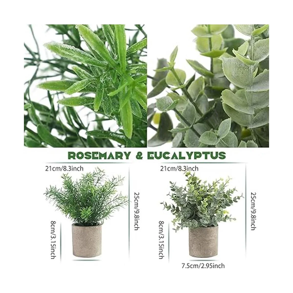 Dimensiones: las 2 plantas suculentas artificiales miden aproximadamente 2.8 in de alto y 2.8 in de ancho. El romero falso en maceta y el eucalipto son de aproximadamente 9.8 in de alto desde la parte superior de la planta hasta la parte inferior de la maceta y 7.9 in de ancho de la punta a la punta de las hojas. Organízalos juntos o deja que cada uno brille por sí solo en espacios separados