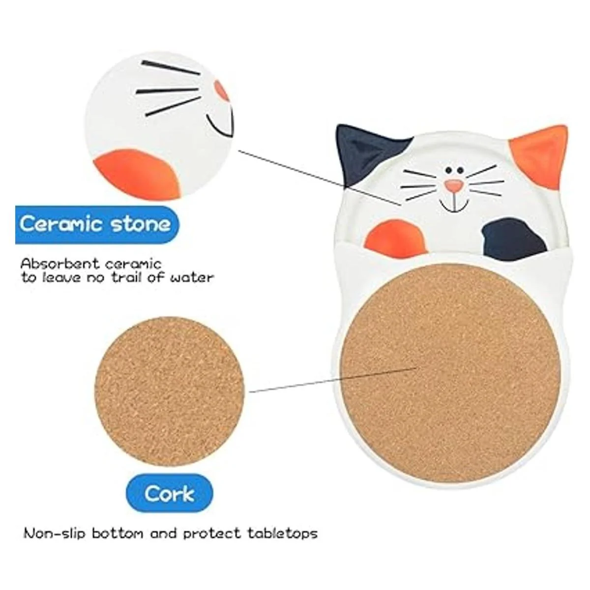 AIPNUN El juego de posavasos de cerámica incluye 4 bonitos posavasos con forma de cara de gato. Tamaño: 4.3 x 4.3 x 0.3 in.