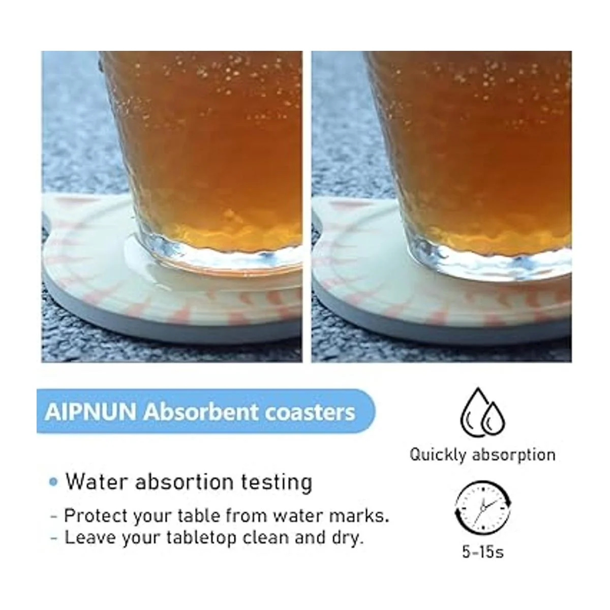 Posavasos para bebidas absorbentes: juego de posavasos de cerámica AIPNUN, en comparación con otros materiales de silicona o madera, los posavasos de cerámica tienen una absorción de agua más fuerte. Puede absorber la bebida derramada en 510 segundos, mantiene la mesa limpia y seca.