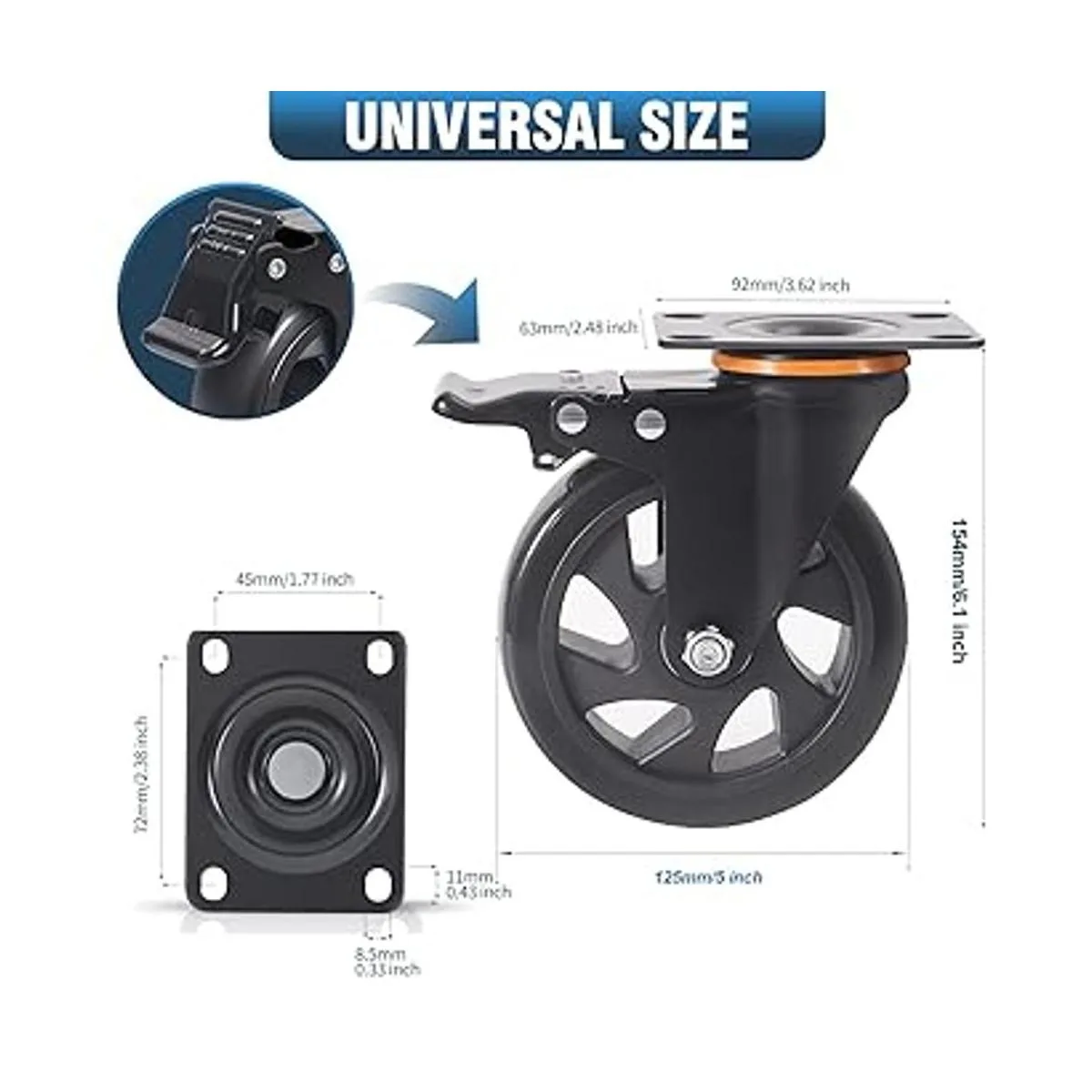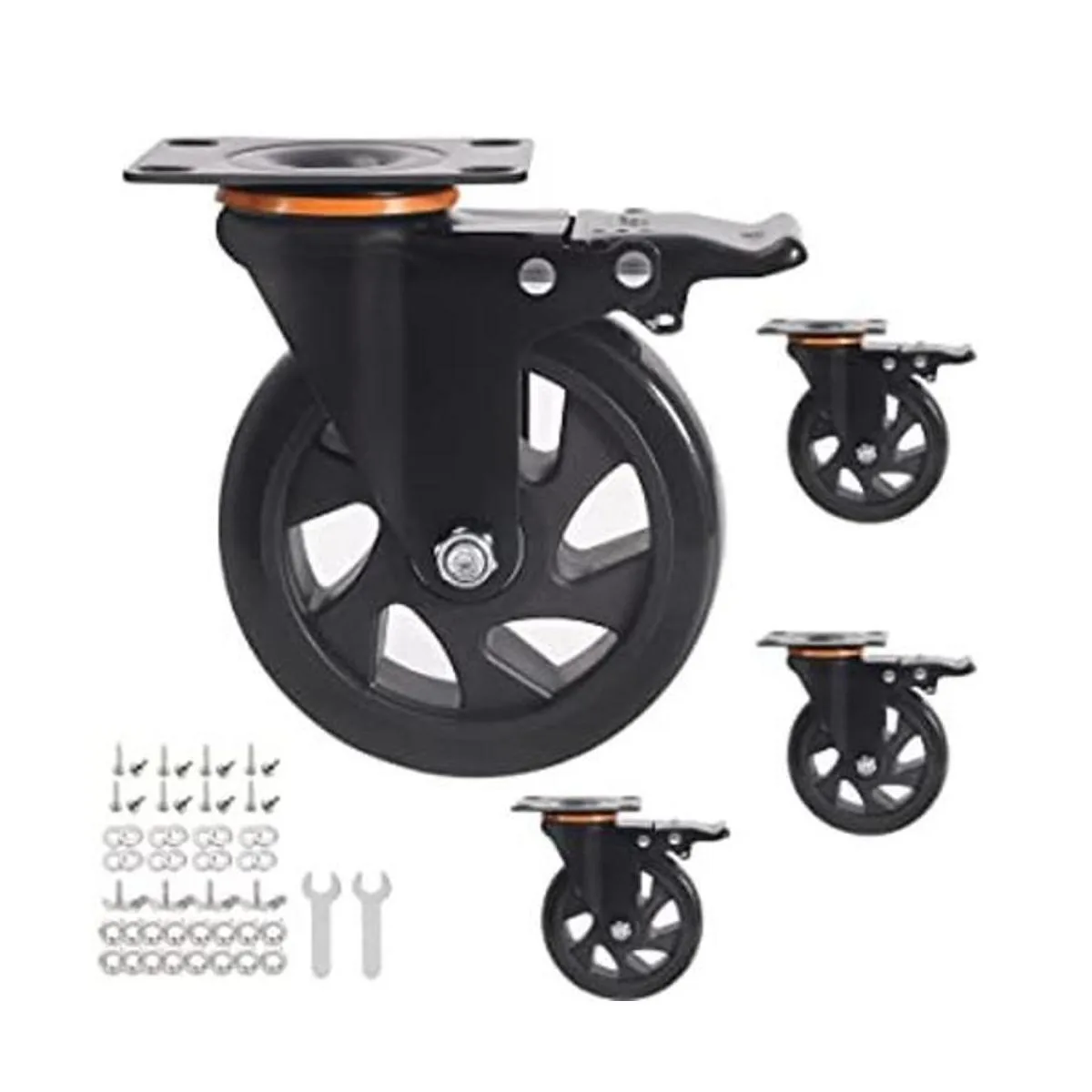 Juego de 4 ruedas giratorias de 5 pulgadas, ruedas resistentes con freno, 2200 libras, ruedas industriales de doble bloqueo de seguridad, ruedas sin ruido para banco de trabajo de carrito con espuma de poliuretano 2 kits de herramientas incluidos