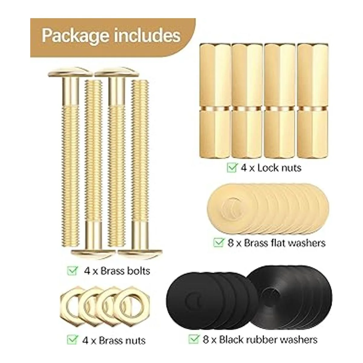 Lo que obtienes: recibirás 8 arandelas planas de latón, 8 arandelas de goma negra, 4 tuercas de latón, 4 pernos de latón y 4 tuercas de bloqueo de latón extralargas. Con estas herramientas, la instalación se puede completar fácilmente incluso en un espacio limitado