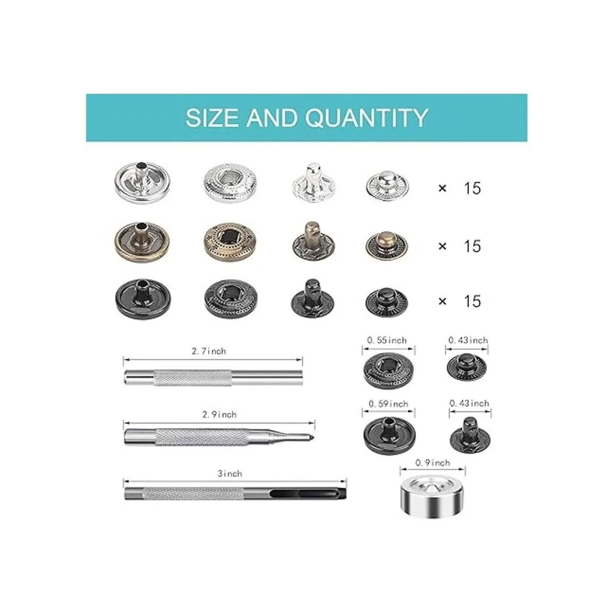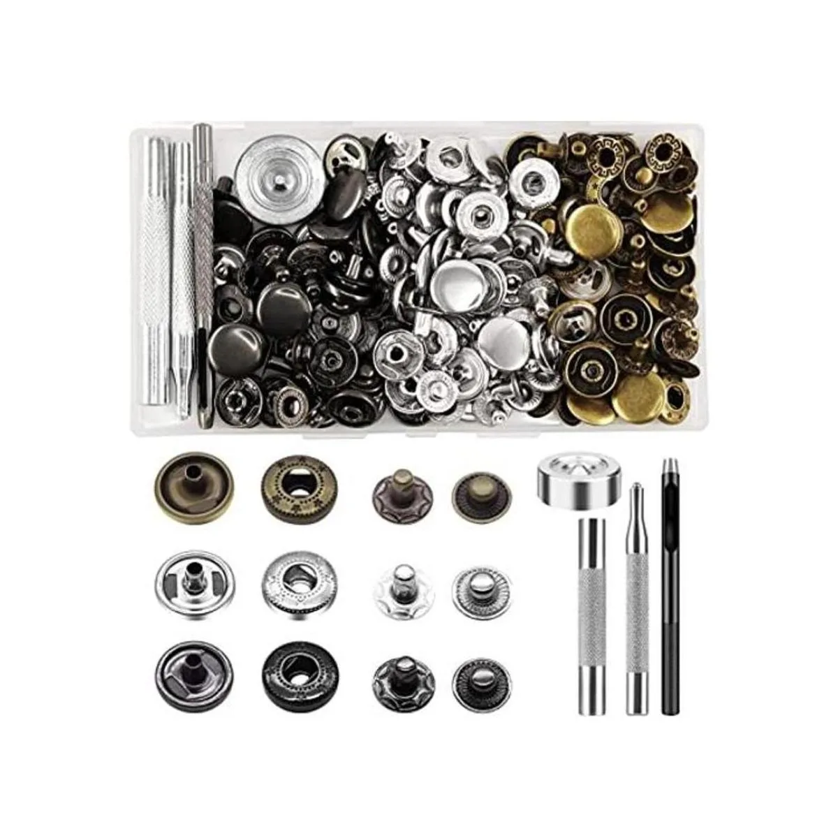 Lo que es difícil: juego de 45 cierres a presión de 0.591 in, 4 herramientas de ajuste, 1 caja de almacenamiento.