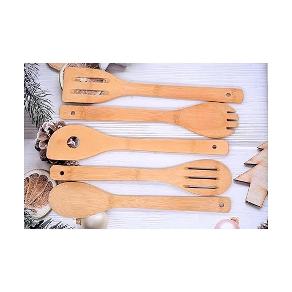 Ampliamente utilizado: los utensilios de bambú son gruesos, fuertes y resistentes, puedes utilizar estos utensilios para saltear a alta temperatura, hornear, mezclar, voltear, se pueden utilizar para tu reunión familiar, cuchara para hornear.