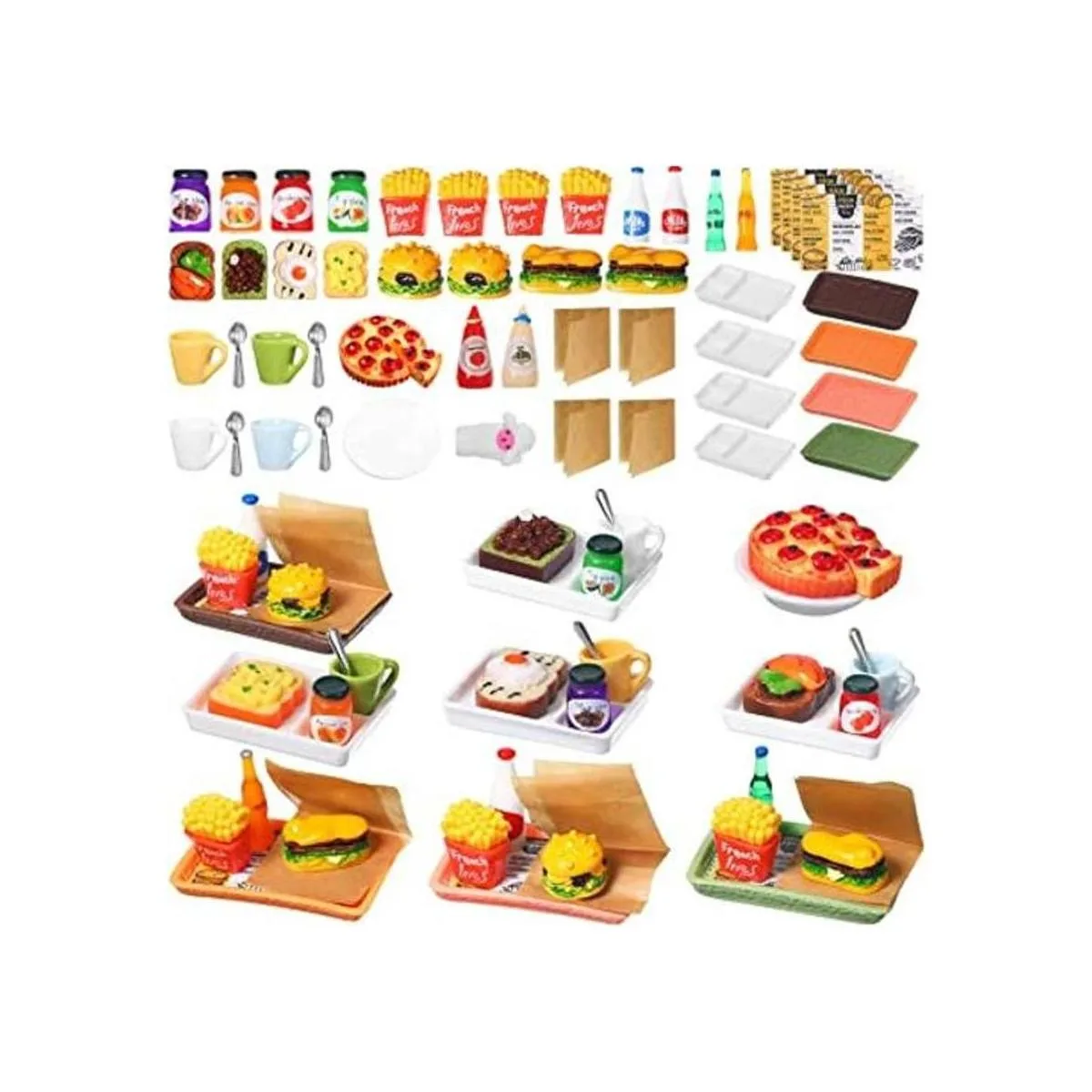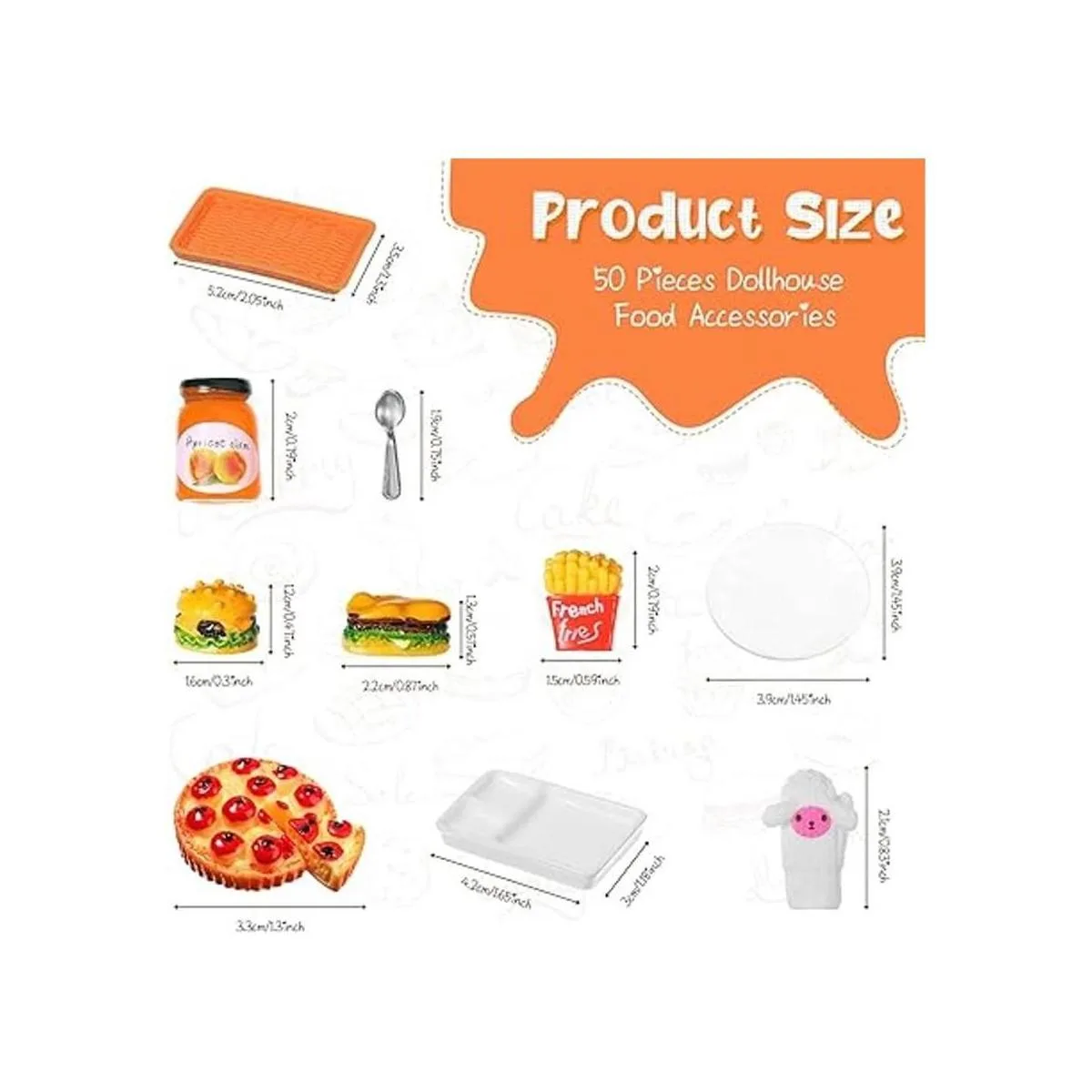 Juego de 50 accesorios de comida rápida en miniatura para casa de muñecas, mezcla de resina, mini hamburguesa, papas fritas, jugo, leche, pan, taza de mermelada, muñeca de cocina, comida de juego para decoración de casa de muñecas y pasteles 112