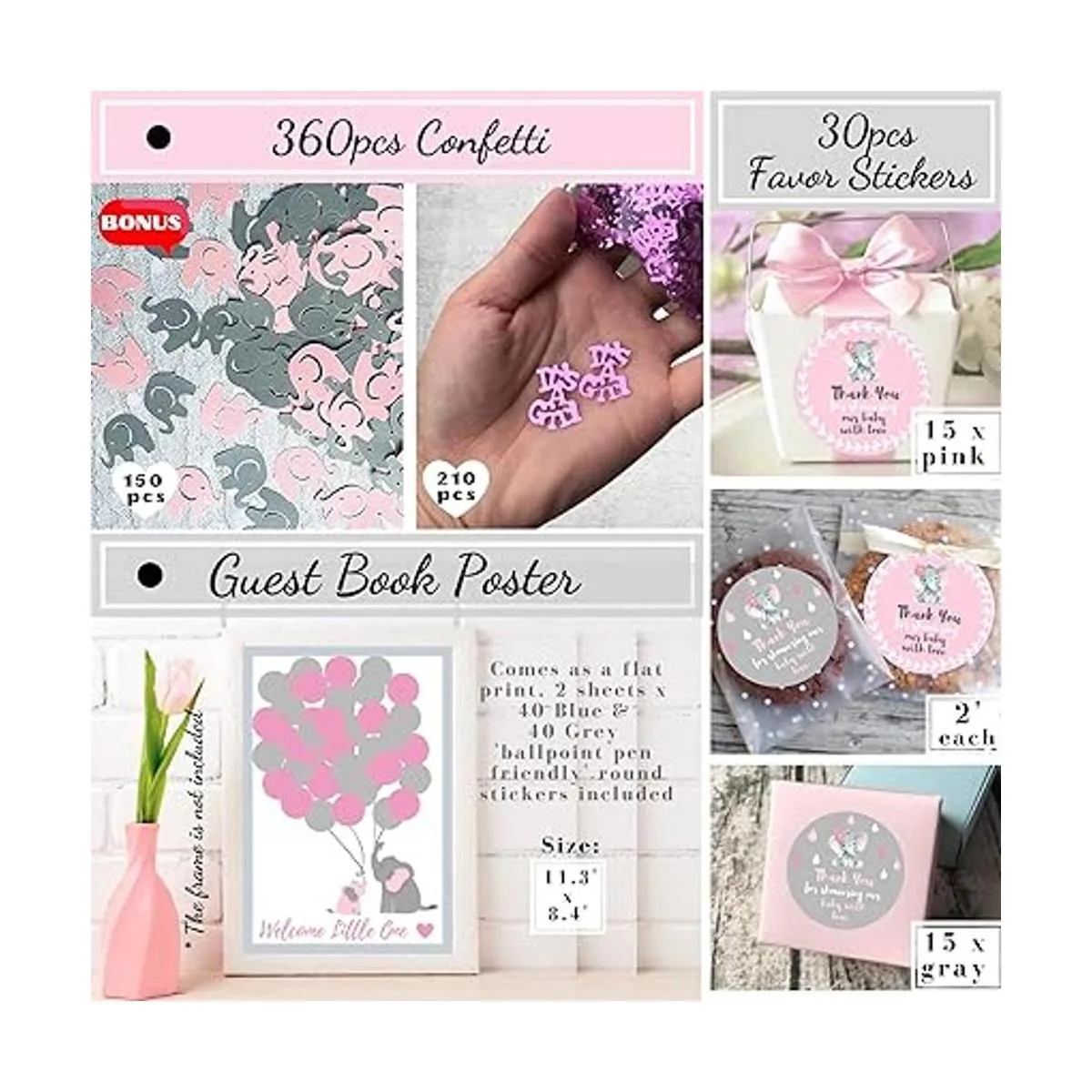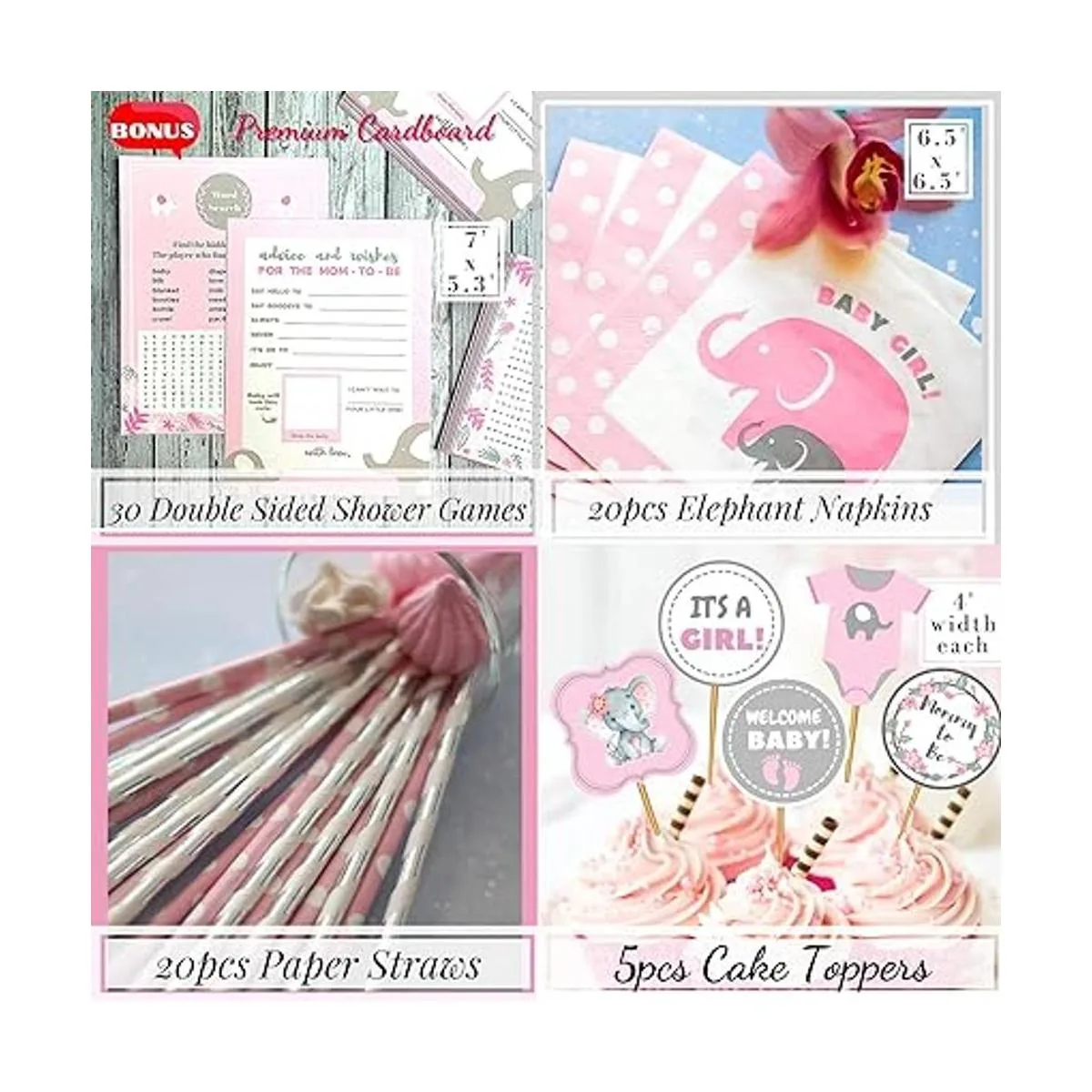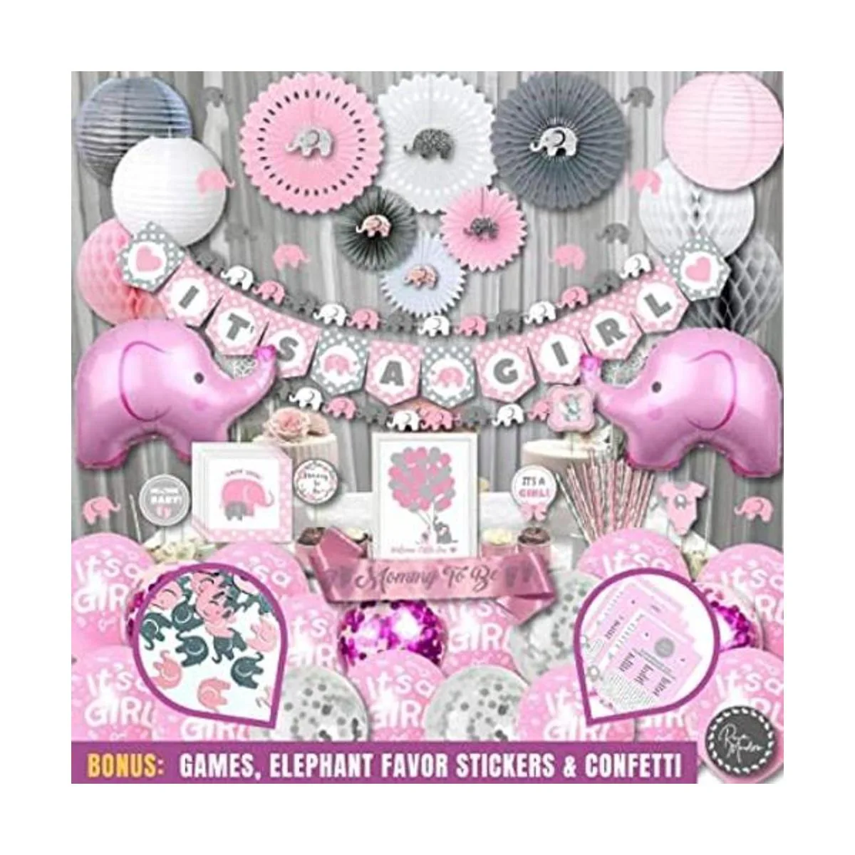 Juego de 587 piezas de decoraciones de baby shower de elefante prémium para niña, es una niña, pancarta, servilletas, pajitas, libro de invitados, linternas de papel, bolas de panal, ventiladores, adornos para pasteles, banda, globos, juegos