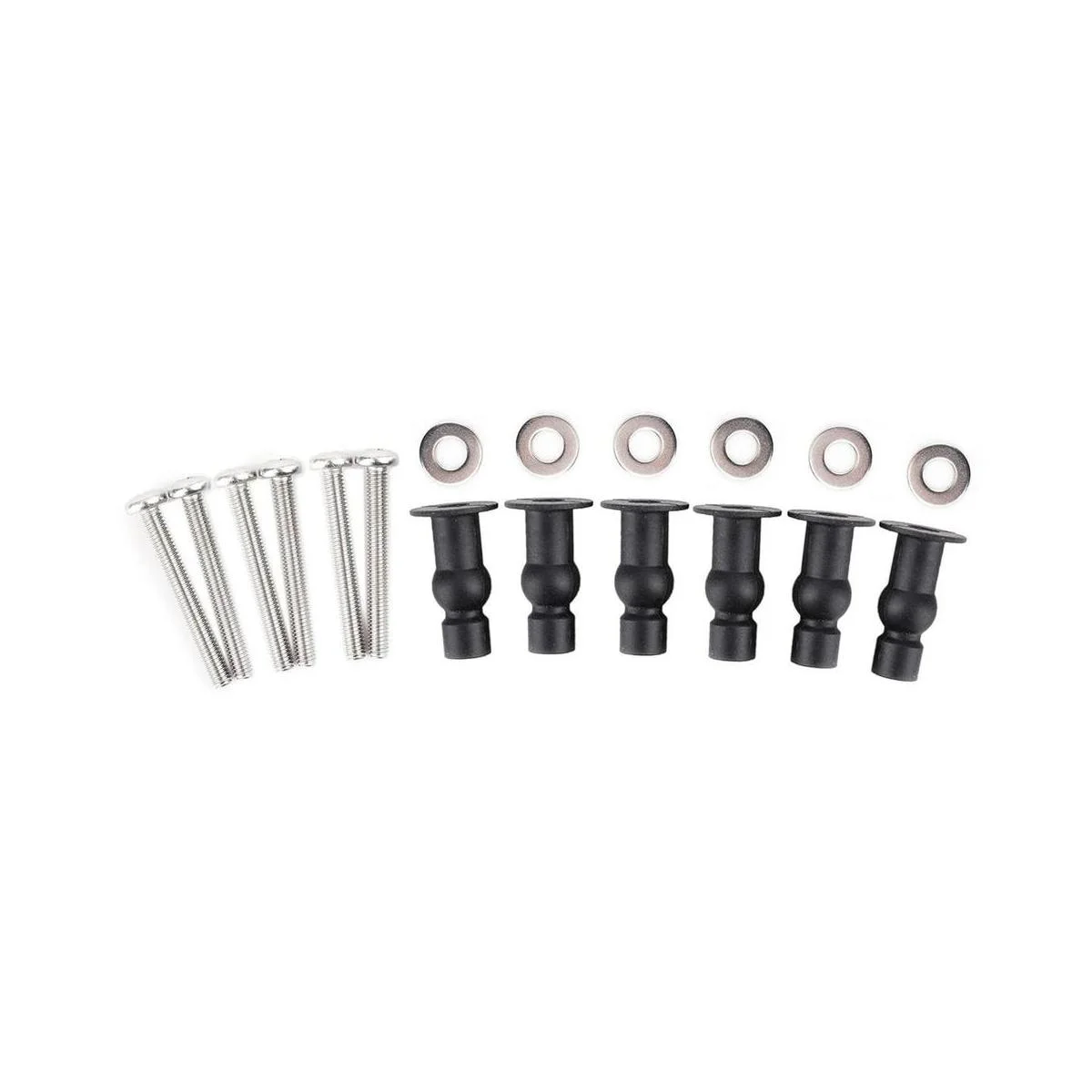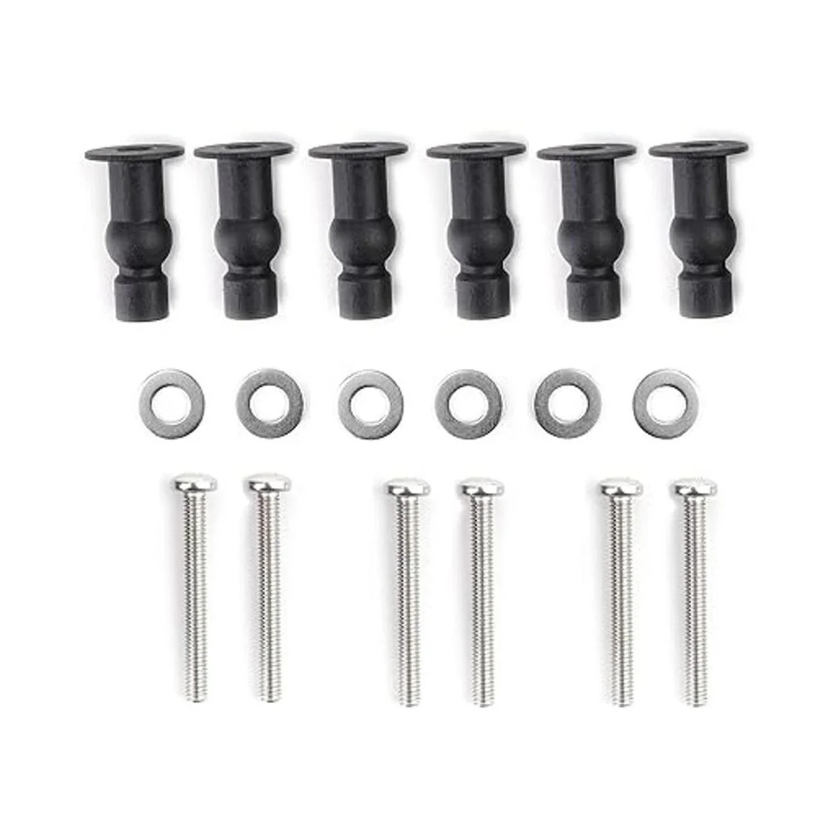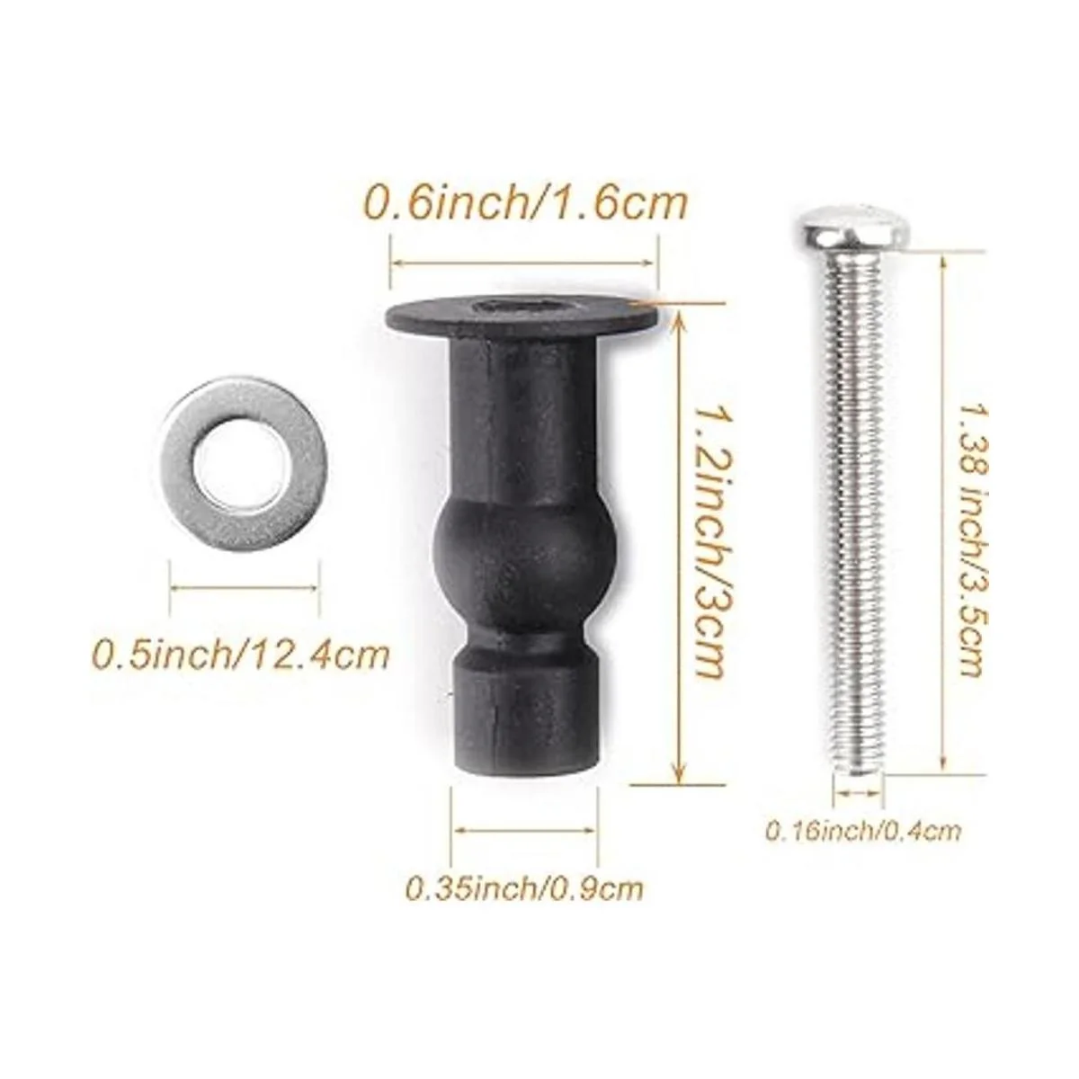 Contenido del paquete e información de tamaño: 6 tornillos de goma expandible negros de 1.2 pulgadas, 6 pernos de 1.4 in de longitud, 6 juntas de acero inoxidable de 0.5 in.