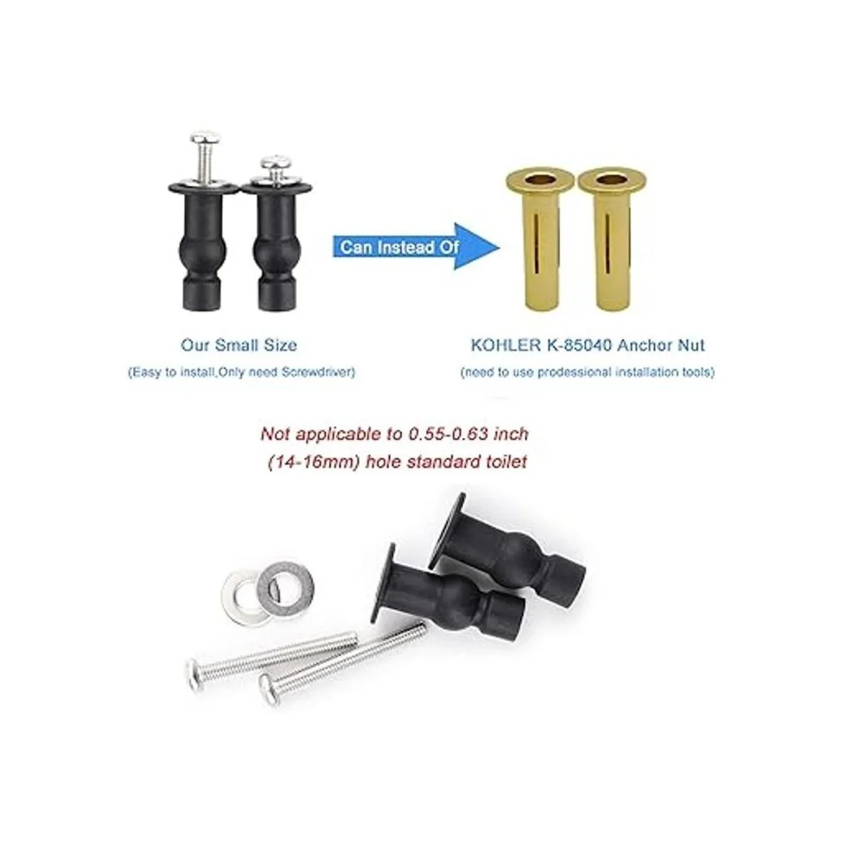 Fijación superior para asiento de inodoro: solo para uso con accesorios de agujero pequeño Kohler. Puede reemplazar la tuerca de anclaje Kohler K85040, K84999 o todas las tuercas de anclaje Kohler 1/420. Estos tornillos para asientos de inodoro se pueden instalar muy fácilmente con un destornillador, sin necesidad de comprar herramientas adicionales.