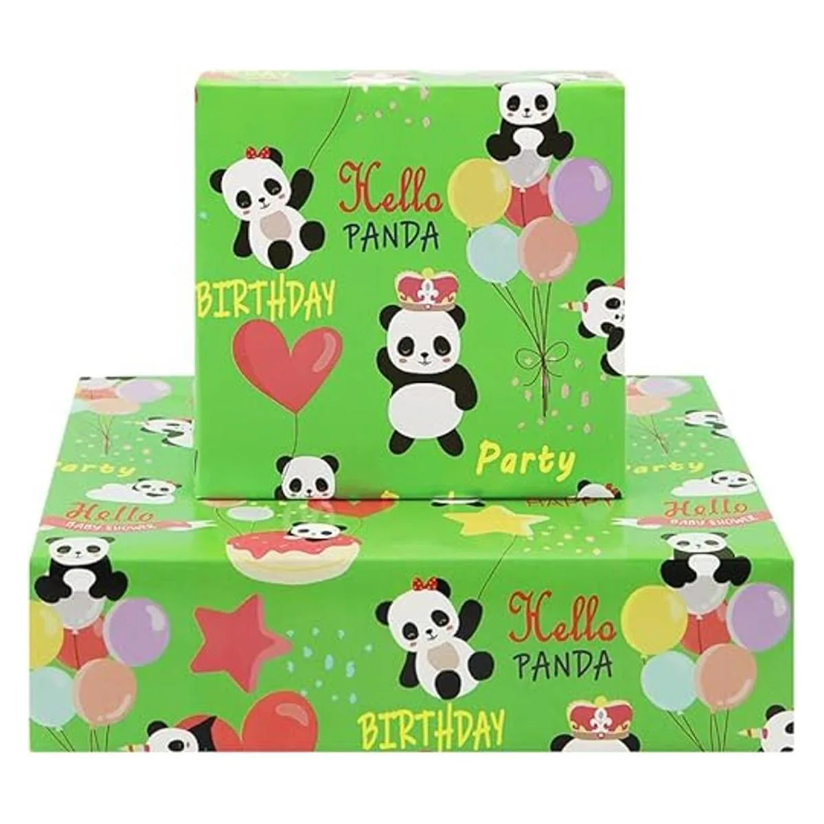 Bonito diseño: este juego de papel de regalo viene con un hermoso diseño: letras de Happy Birthday en colores mixtos en papel de regalo verde, que definitivamente te trae un fuerte impacto visual y te impresiona. Los patrones incluyen panda con corazones, panda con corona, hola baby shower, Hello Panda.