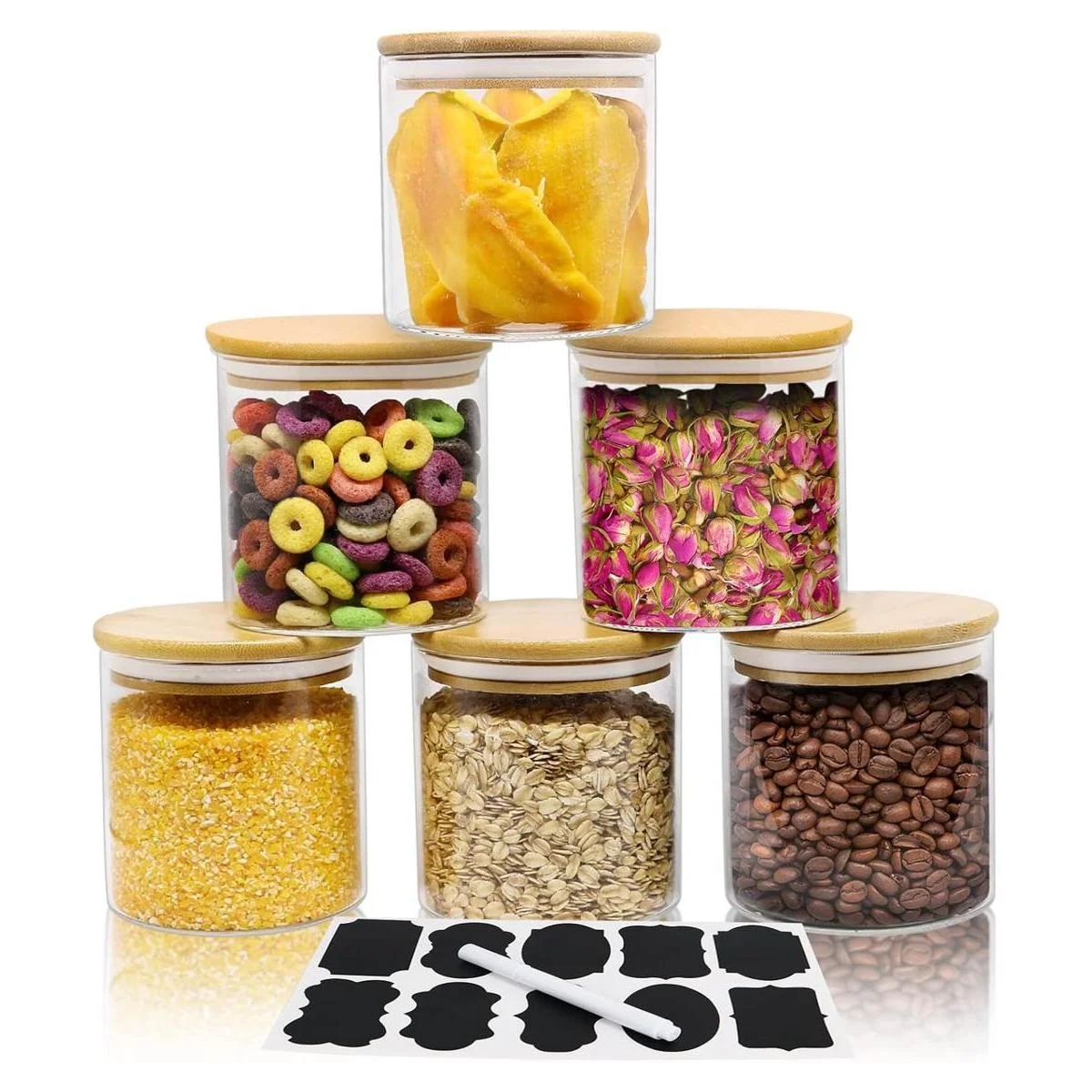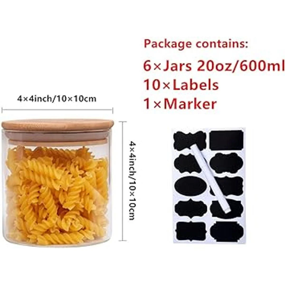 Juego de 6 tarros de almacenamiento de vidrio con tapas y etiquetas herméticas de bambú, tarros de vidrio de 20.3 fl oz, recipientes de almacenamiento de alimentos para cocina en el hogar, despensa, té, azúcar, sal, café, harina, hierbas, granos