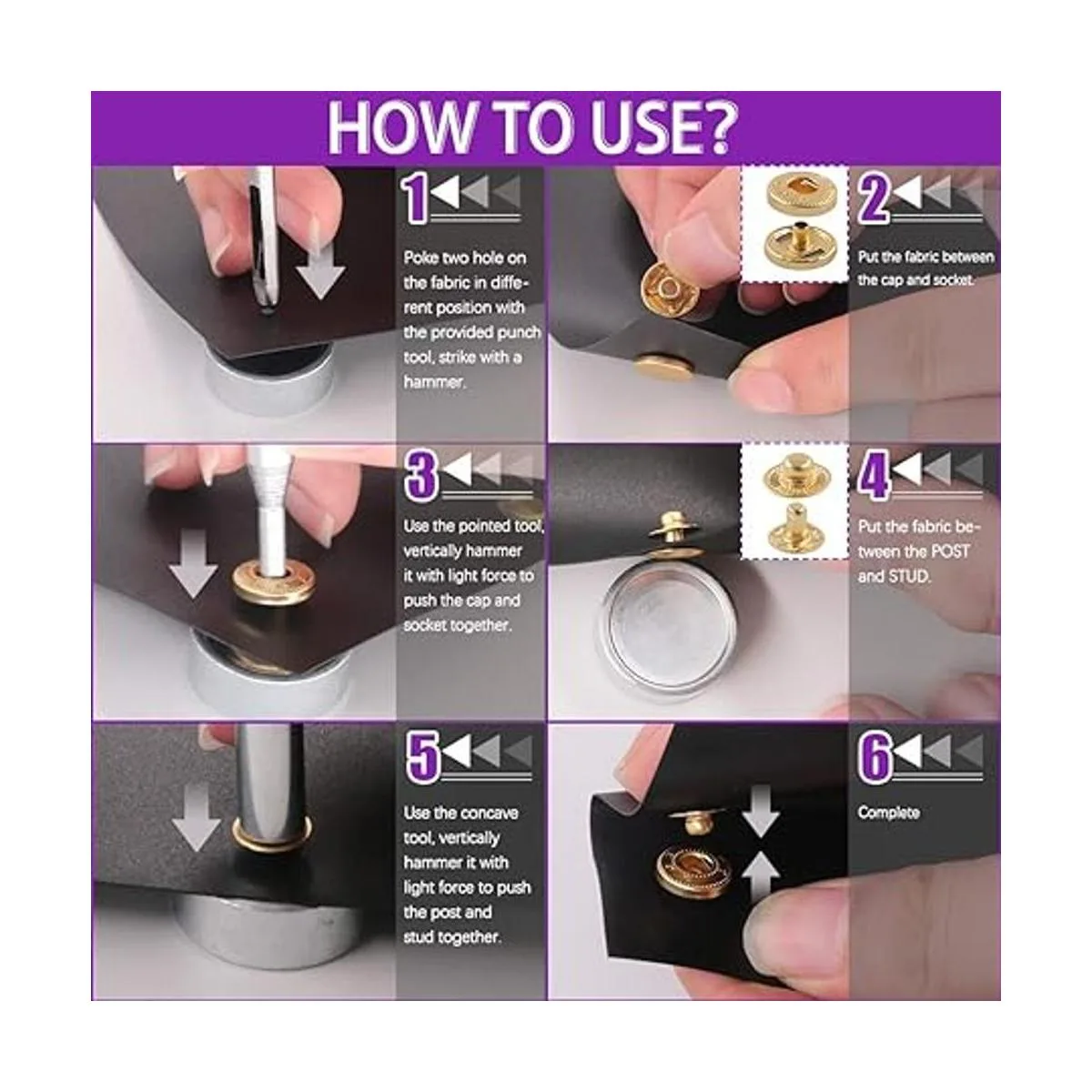 6 colores diferentes En este kit, preparamos oro, plata, bronce, plomizo, negro mate y negro azabache. 60 juegos en total, 10 juegos de cierres a presión de cada color. Cada juego está hecho de tapa, enchufe, poste y tachuela. El diámetro de la tapa es de aproximadamente 0.492 in. El grosor es de 0.236 in.
