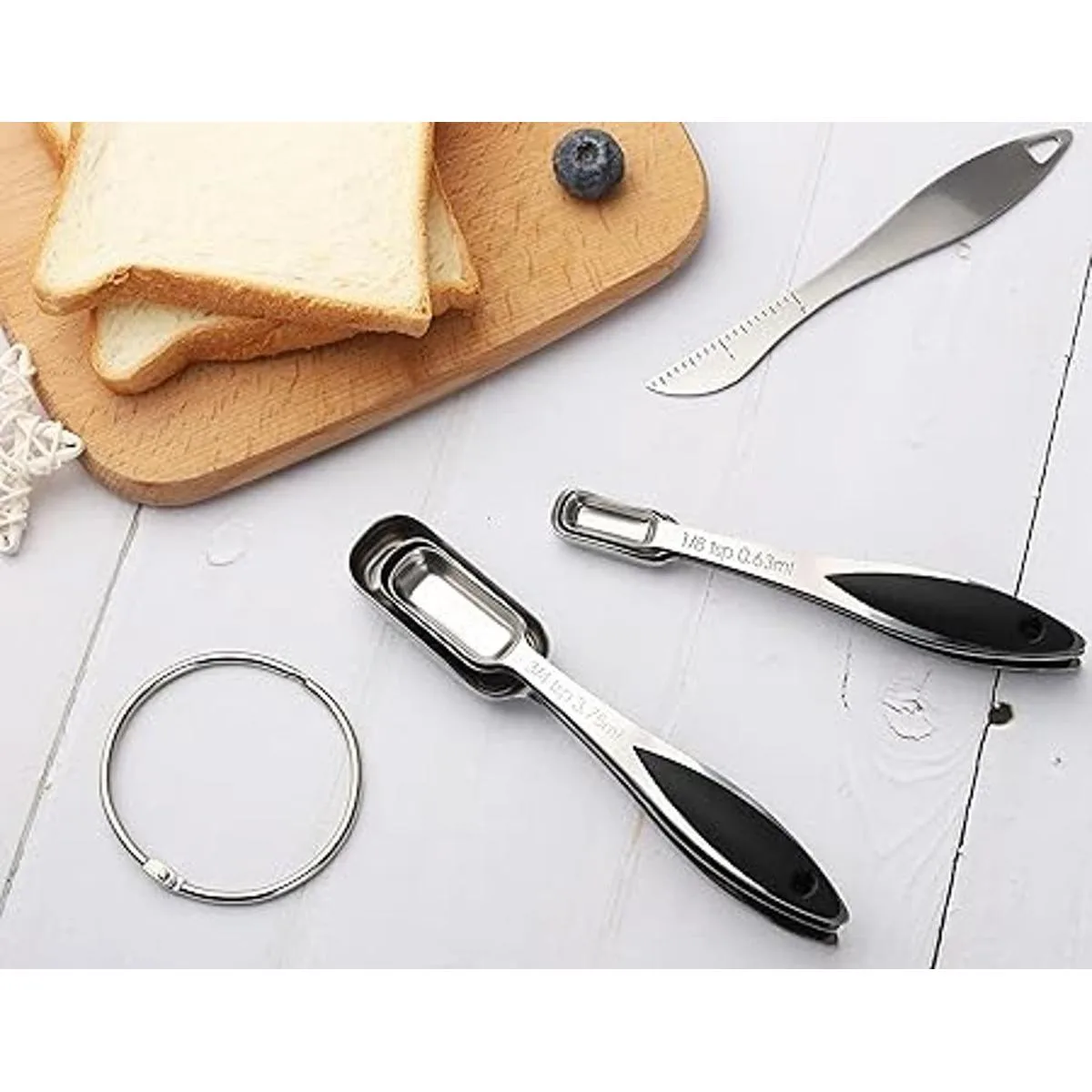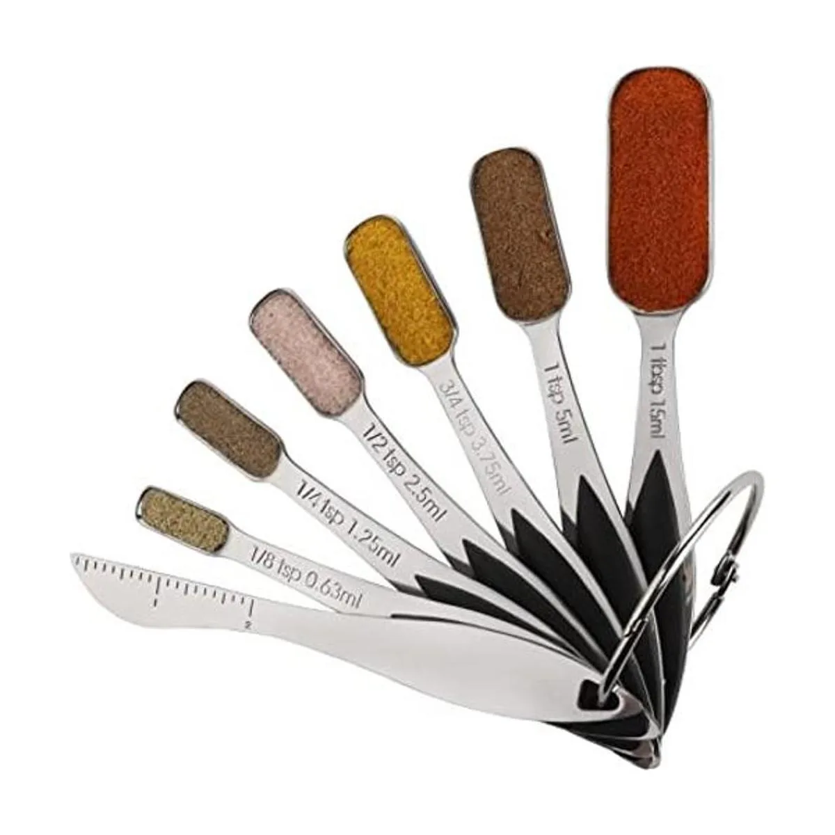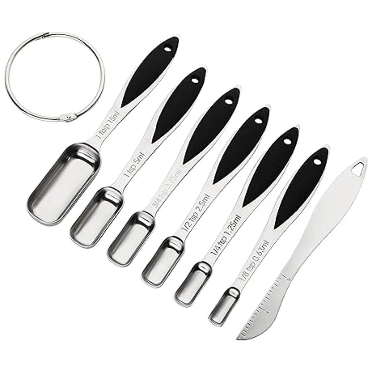 Juego de cucharas medidoras: este juego de cucharas medidoras de acero inoxidable incluye 1/8 cucharadita, 1/4 cucharadita, 1/2 cucharadita, 3/4 cucharadita, 1 cucharada y 1 nivelador. Varios tamaños para tus necesidades.