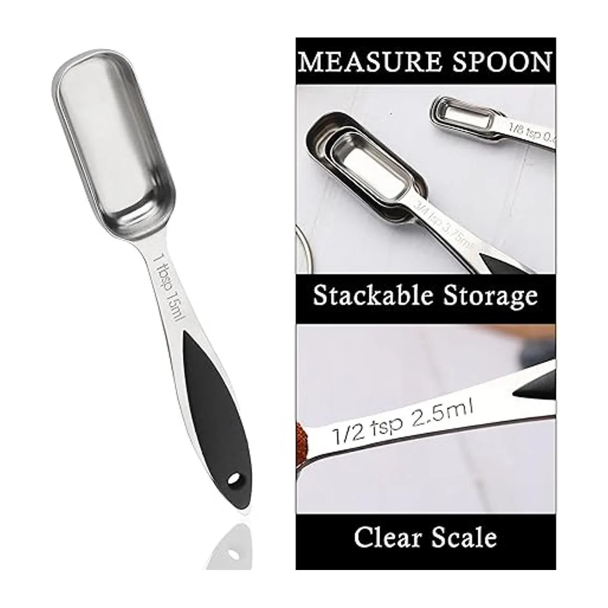 Cucharas apilables: este juego de cucharas medidoras está equipado con un anillo de almacenamiento de acero inoxidable, que se puede colgar, y la parte inferior de la cuchara es suave, y también se puede apilar para almacenamiento. Fácil de almacenar.