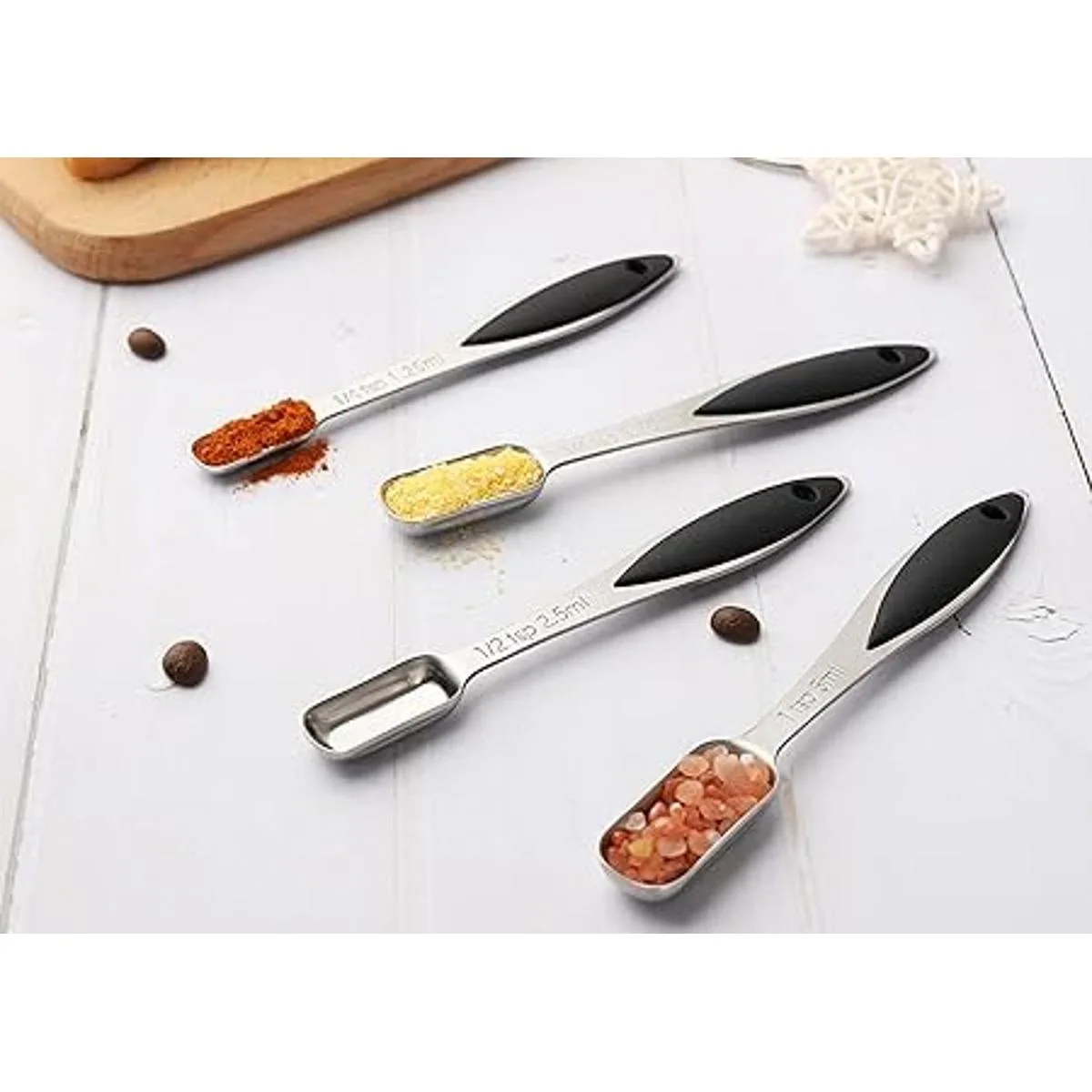 Alta calidad: la cuchara medidora está hecha de acero inoxidable resistente de alta calidad, el material es resistente y no es fácil de doblar. Y fácil de limpiar. El mango de la cuchara medidora está incrustado con gel de sílice, lo que te hace sentir cómodo cuando usas las cucharillas.