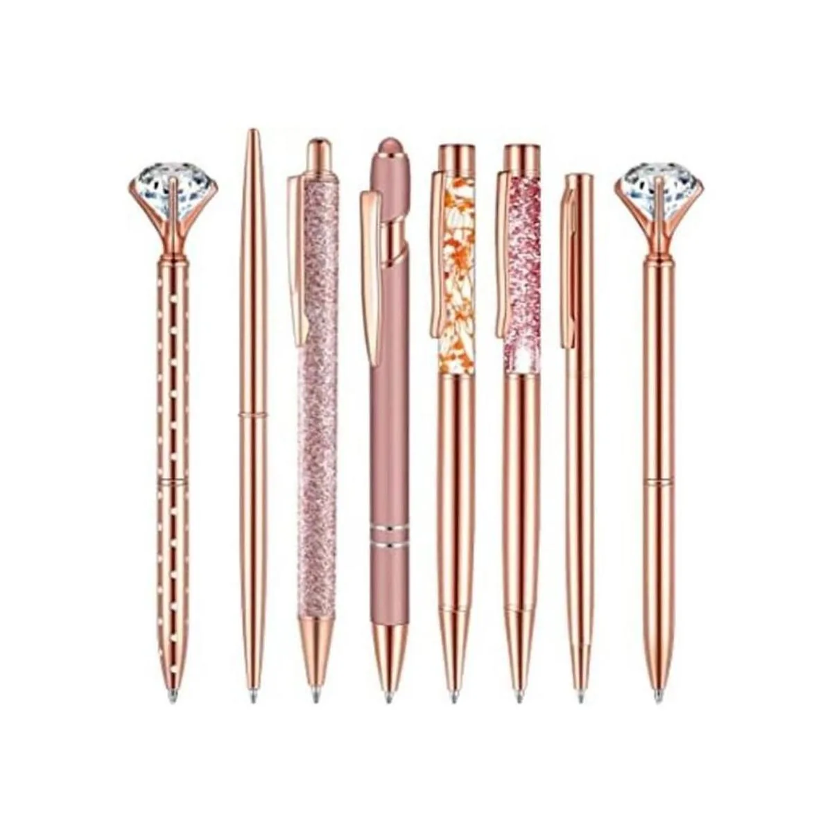 Juego de 8 bolígrafos de color oro rosa, con purpurina de arena líquida, bolígrafos de metal, bolígrafos de cristal con diamantes de imitación, bolígrafo de tinta negra, regalos para boda, oficina, suministros de escritorio de oro rosa