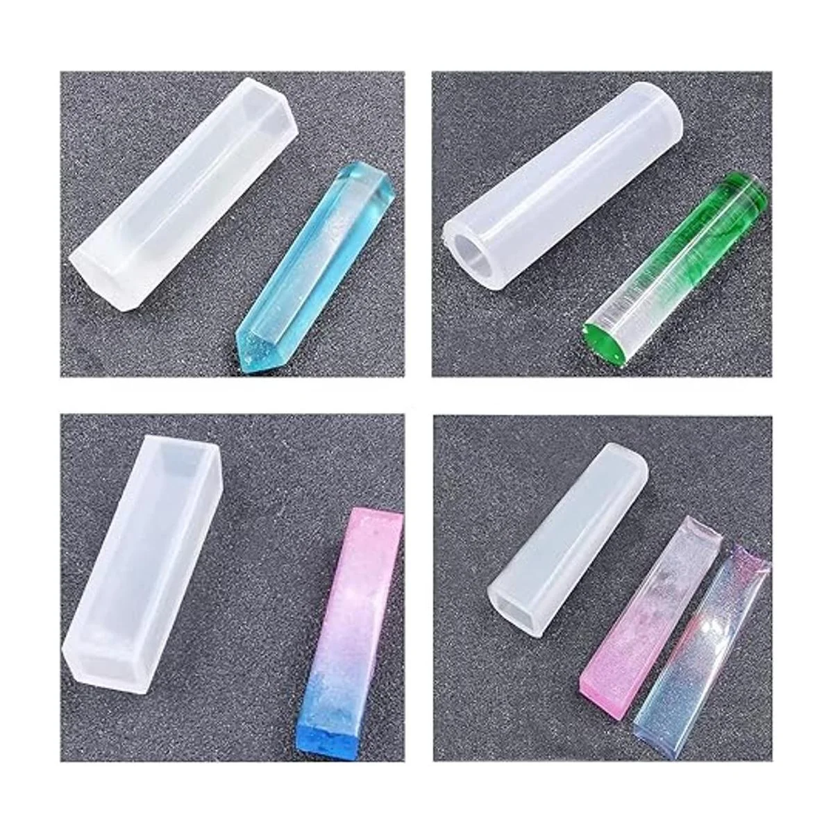 El paquete incluye: 2 moldes rectangulares y 2 cuadrados de silicona en diferentes tamaños y 4 moldes de resina epoxi colgantes en diferentes formas.