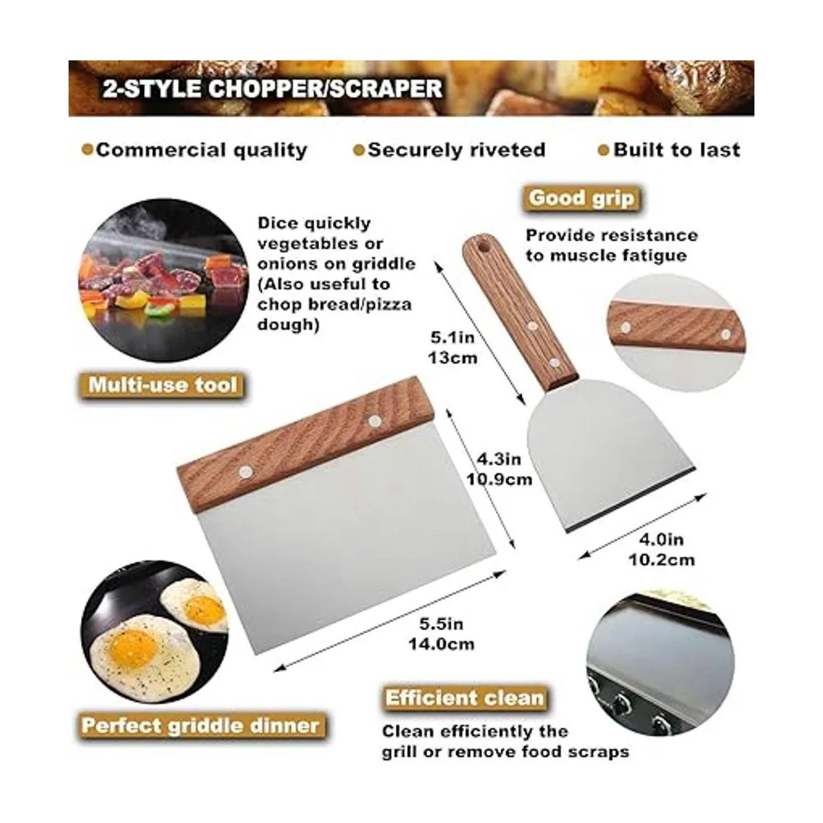 Professional Grade Griddle Tools Made with high quality stainless steel and premium solid wood being upgraded to no more loose, no more crack, no more fade, ecofriendly.