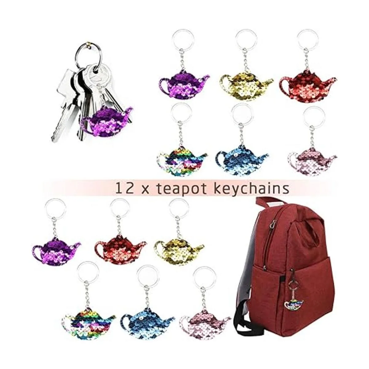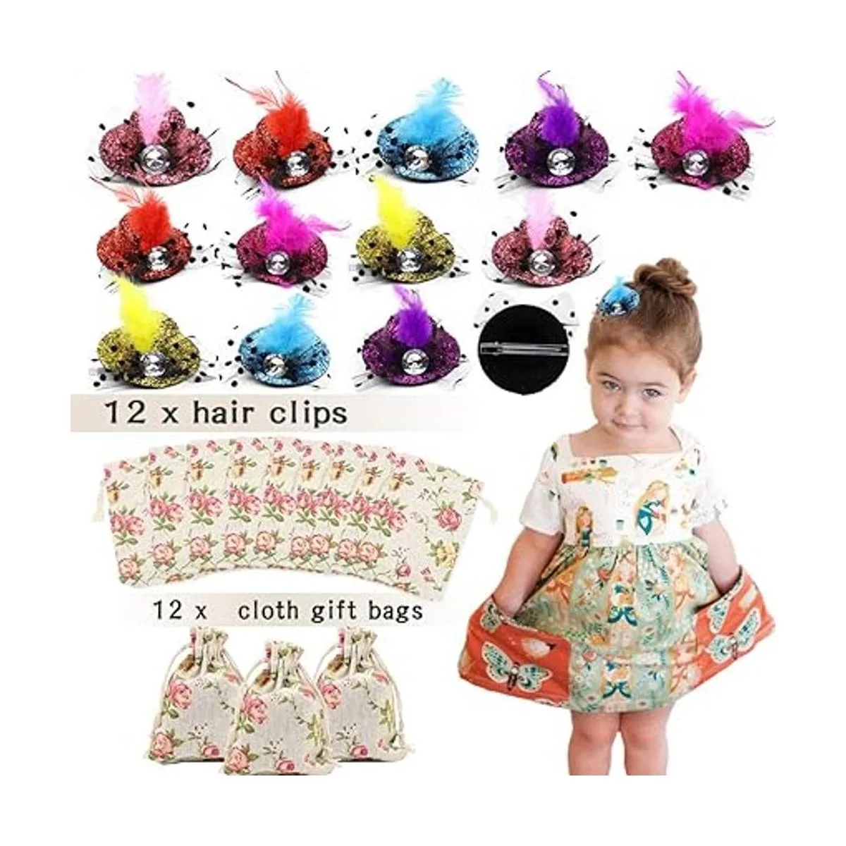 El paquete incluye: 12 pinzas para el cabello para sombrero, 12 collares de perlas, 12 pulseras de perlas, 12 ventiladores plegables, 12 llaveros de tetera de lentejuelas, 12 bolsas de regalo con patrón de rosa, 12 mini cuentas de tetera de cristal