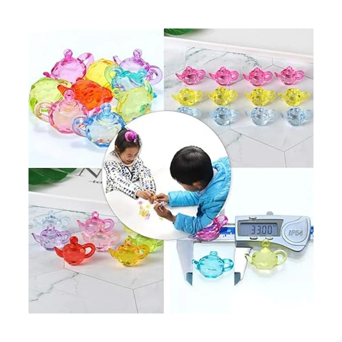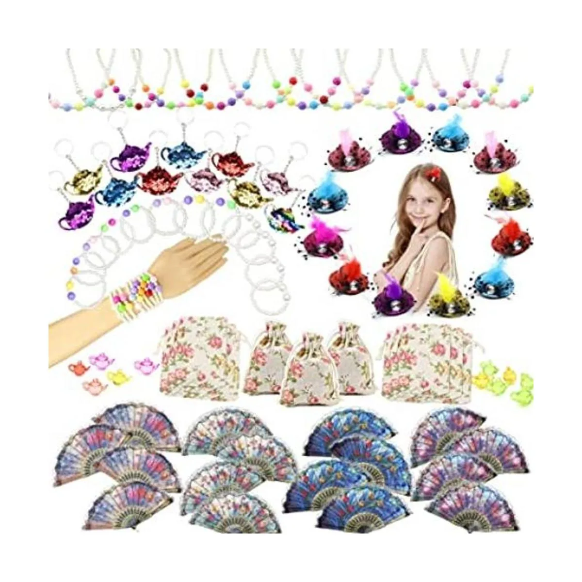 Juego de 84 piezas de recuerdos de fiesta de té, pinzas para el cabello para fiestas de té, collares, pulseras, abanicos, llaveros, cuentas de tetera, bolsas de regalo, kit de accesorios para niños y niñas, bolsa de regalo de cumpleaños, juguetes de regalo