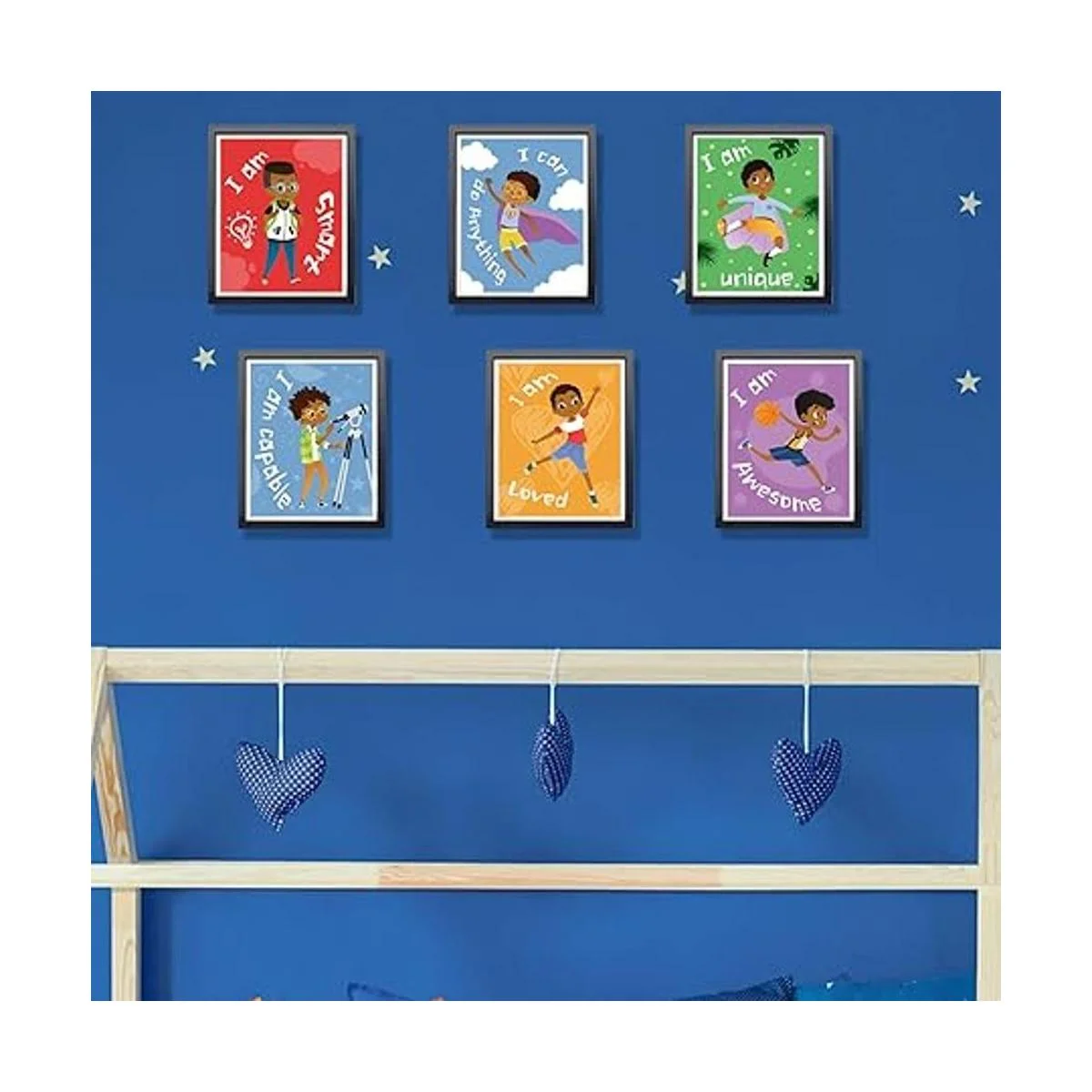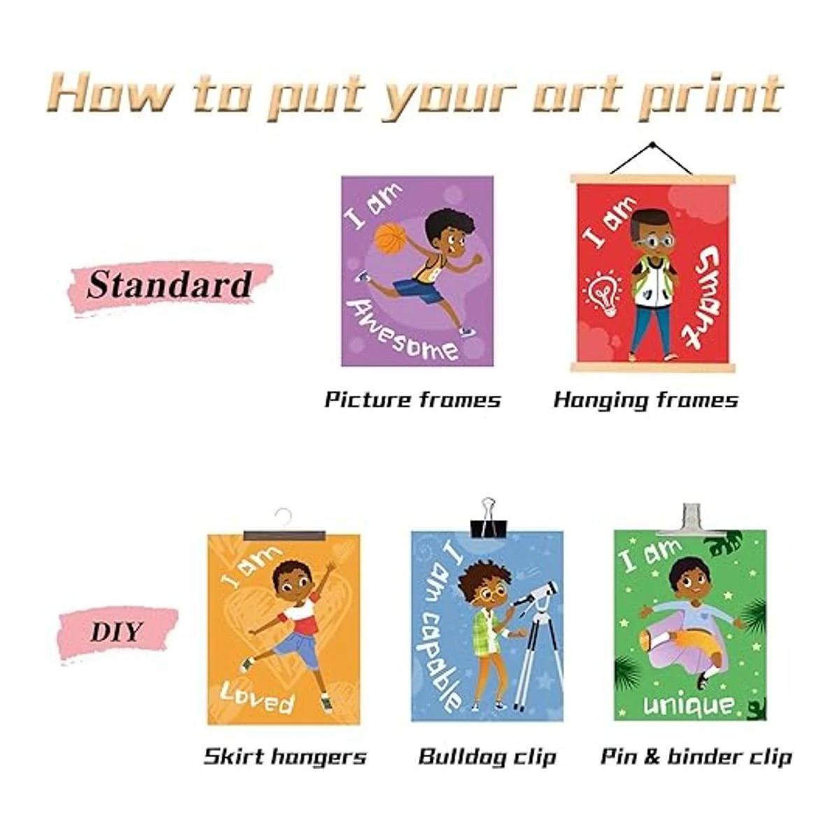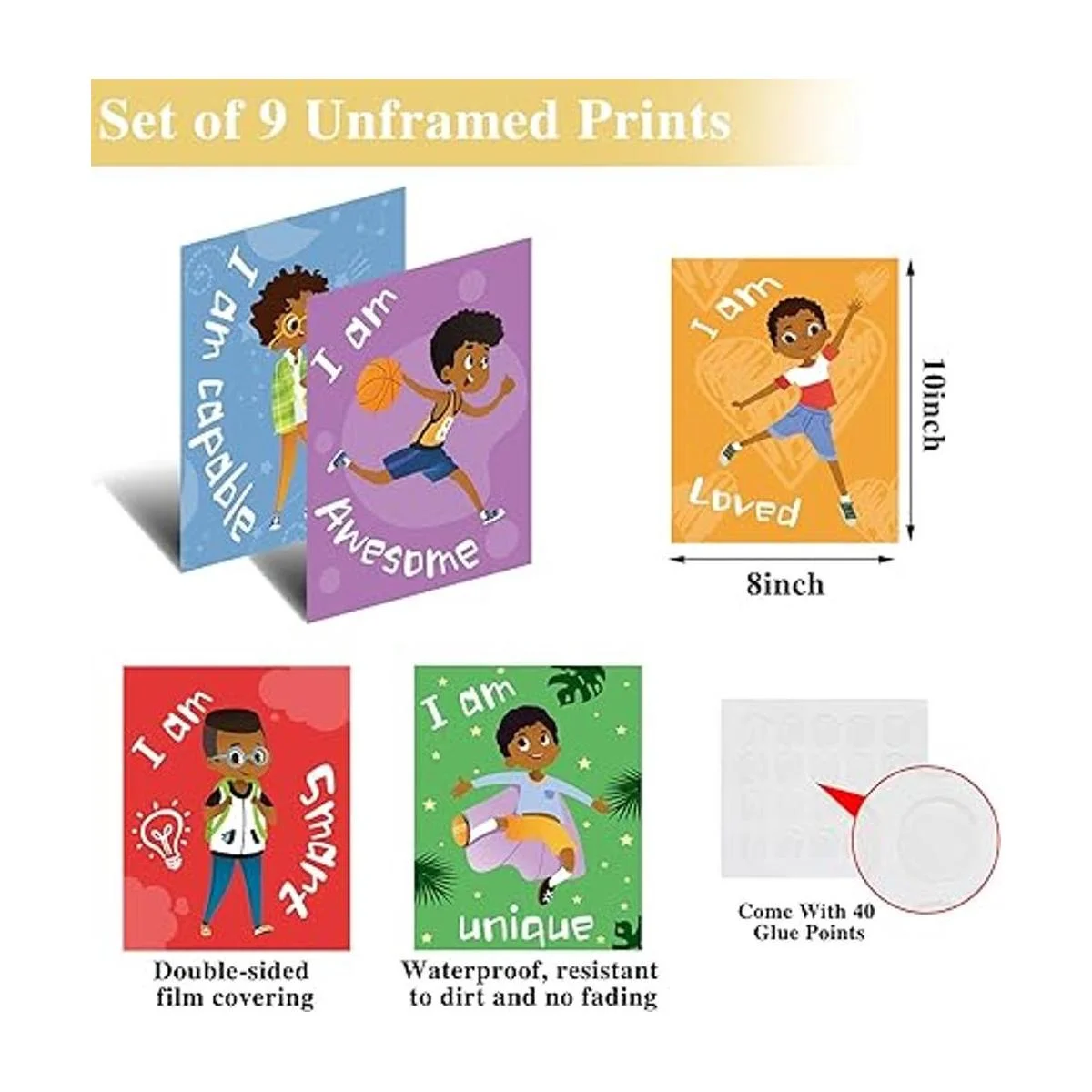 El paquete incluye: juego de 9 carteles motivacionales para decoración de pared de niño negro. Cada pintura positiva para niño pequeño es diferente, y cada póster del juego es de 8 pulgadas de largo por 10 pulgadas de alto, es el tamaño adecuado para decorar artículos en la habitación de un niño.
