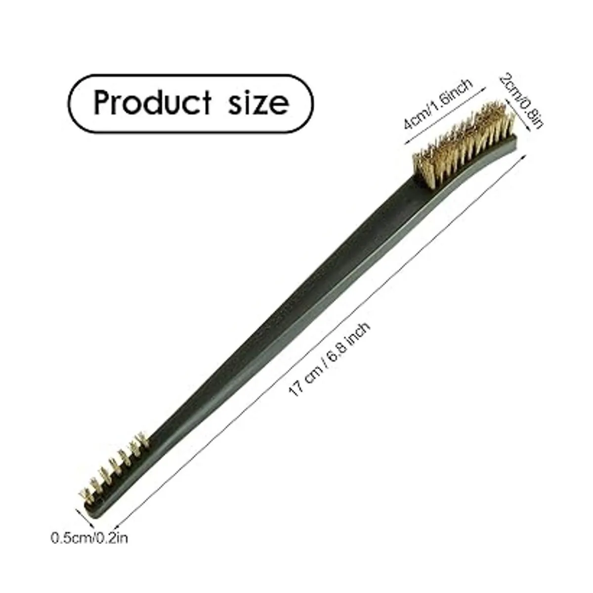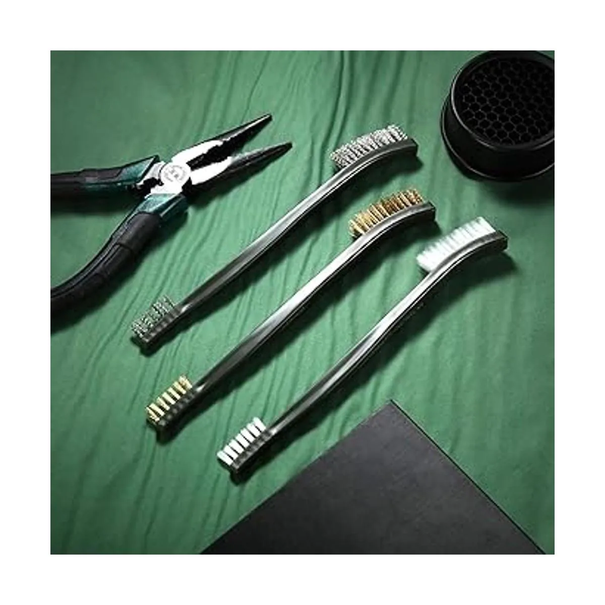Cepillo de latón: el cepillo de alambre de latón puede limpiar piezas de metal sin terminar como roscas de tornillo, terminales de conexión y herramientas de corte, no dañará superficies o características finas, lo que puede satisfacer la mayoría de tus necesidades de limpieza