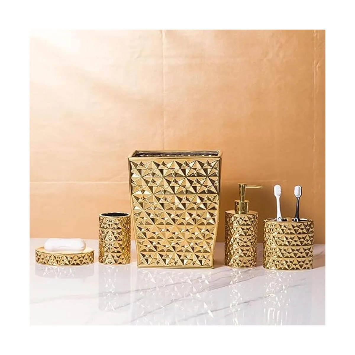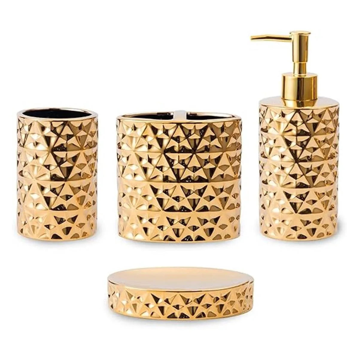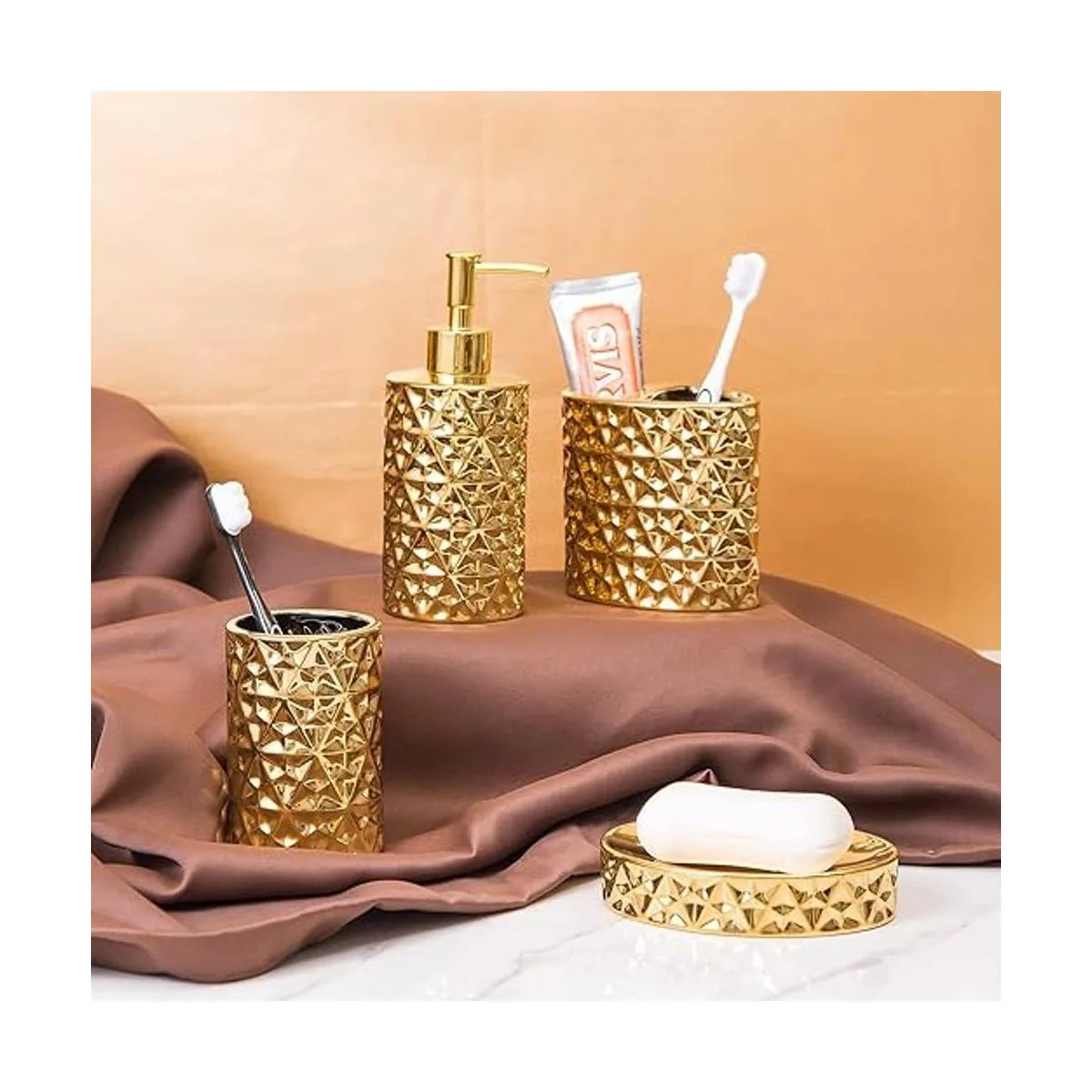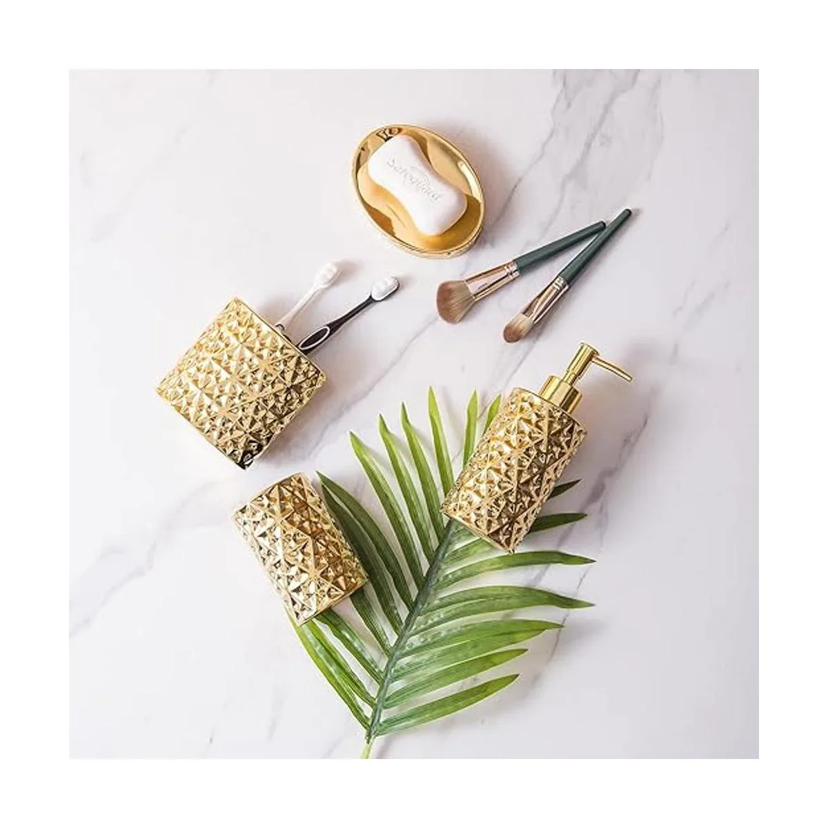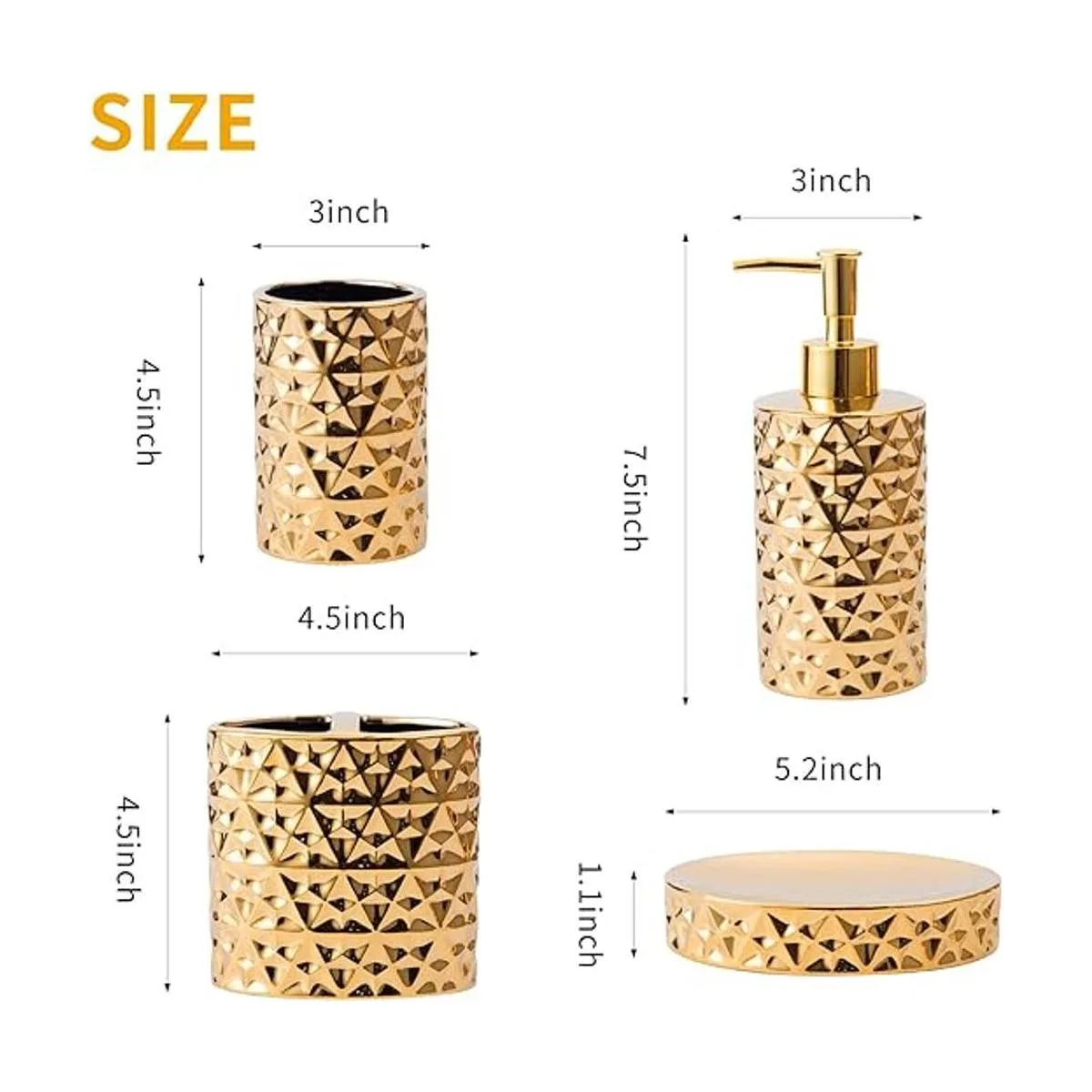 Juego de accesorios de baño dorados de 4 piezas para regalo de cerámica, incluye dispensador de jabón, soporte para cepillos de dientes, taza para cepillo de dientes, jabonera para encimera decorativa y regalo de inauguración de la casa
