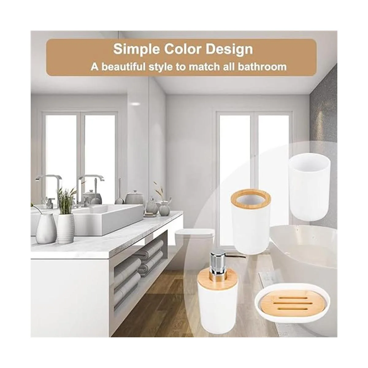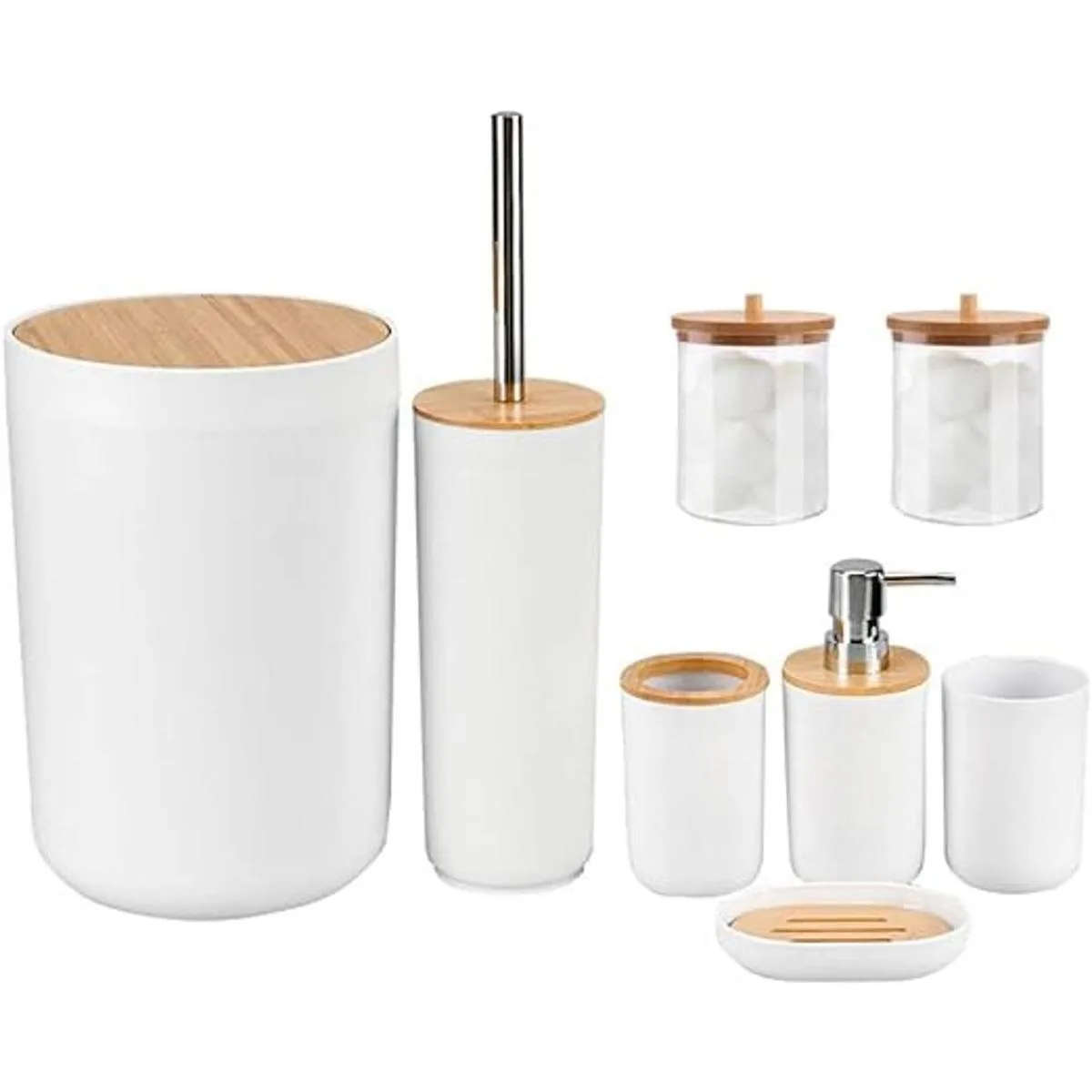Juego de accesorios de baño, juego de 8 piezas de plástico para regalo para cepillos de dientes, taza para cepillos de dientes, dispensador de jabón, jabonera, soporte para cepillos de inodoro, cubo de basura, lata de algodón para baño bambú blanco, 8 piezas