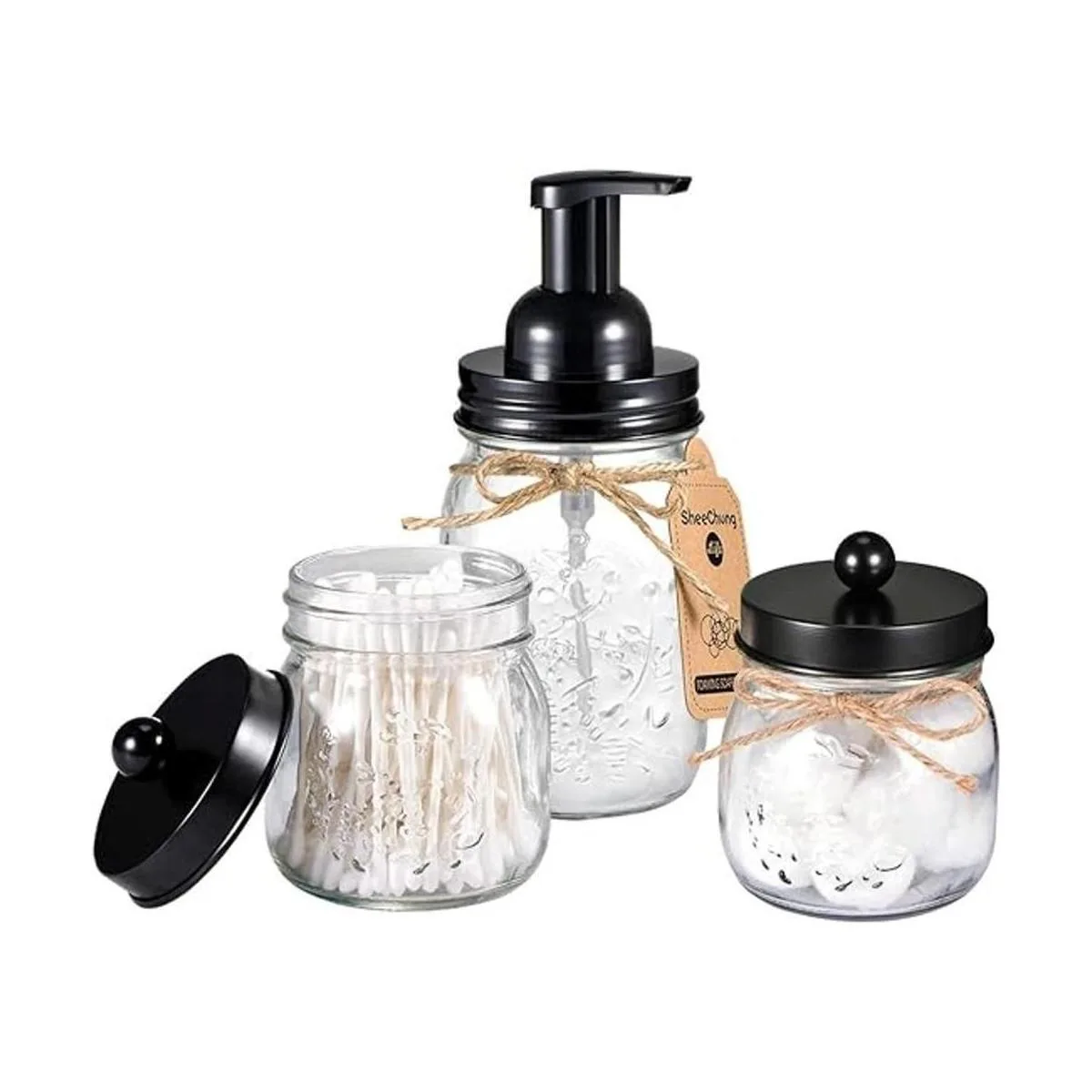 Juego de accesorios de baño Mason Jar Dispensador de jabón de manos espumoso y soporte Qtip Decoración rústica de casa de campo, tarros de boticario, encimera de baño y organizador de tocador negro, patente pendiente