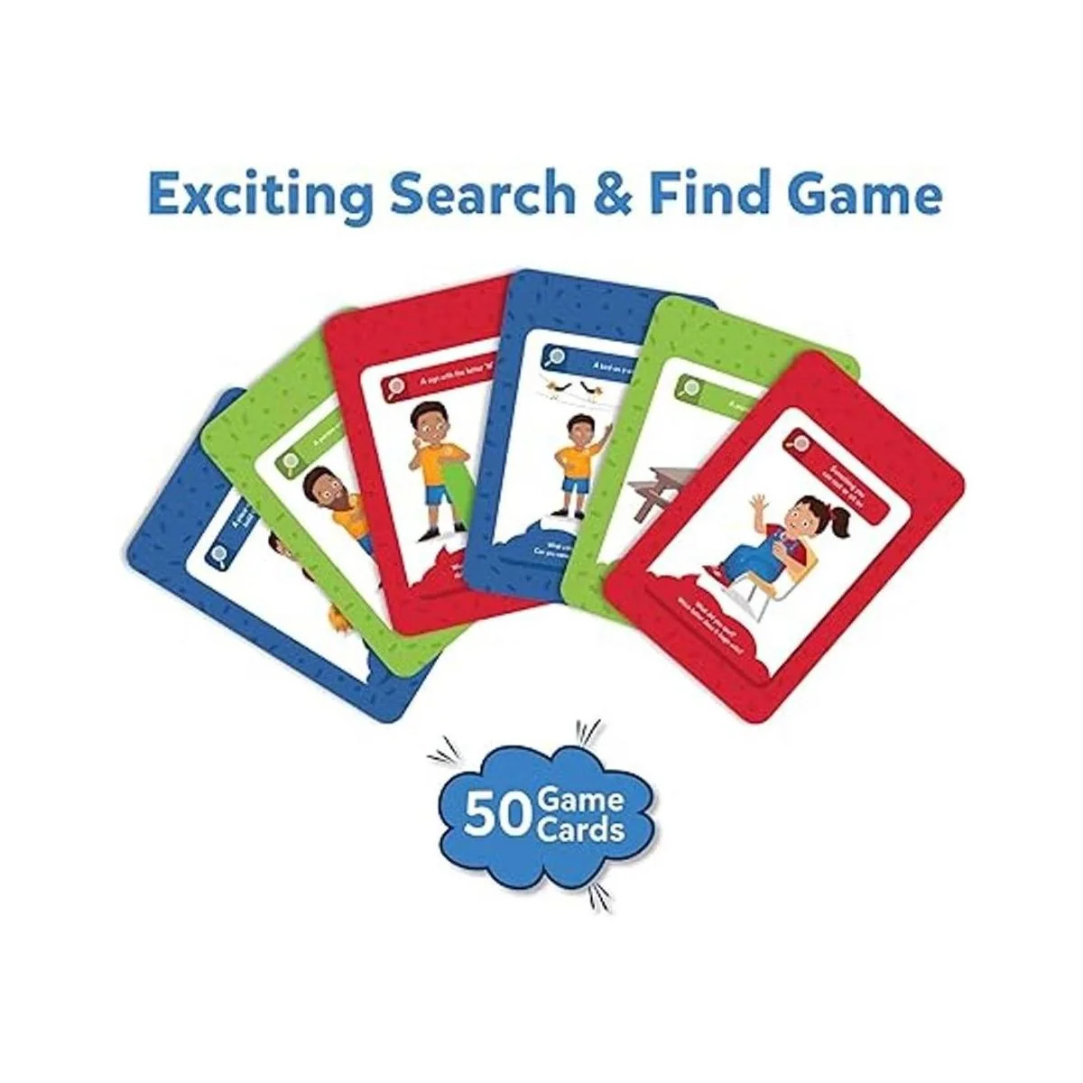 La búsqueda del tesoro inteligente: lo encontré es un emocionante juego que ayuda a los niños a aprender mientras juegan el más emocionante Busca y encuentra. Con indicaciones como Puedes encontrar… algo que crece Un cartel con el número 6, etc. Los jugadores deben gritar lo encontré. tan pronto como encuentren el objeto. El primero que gane 7 cartas gana el juego.
