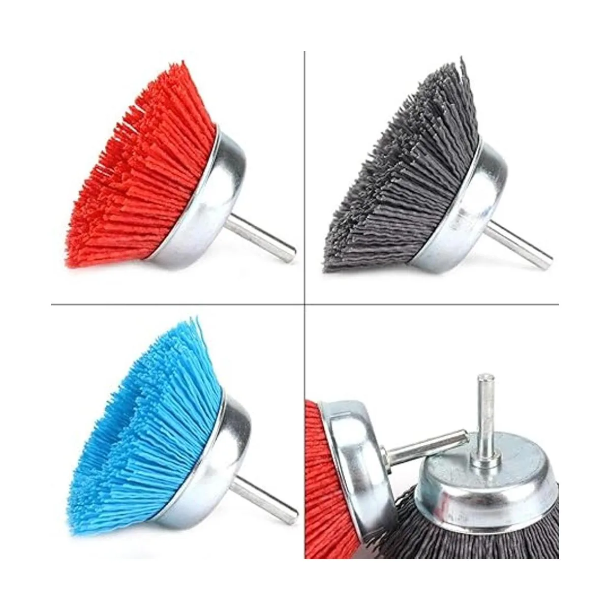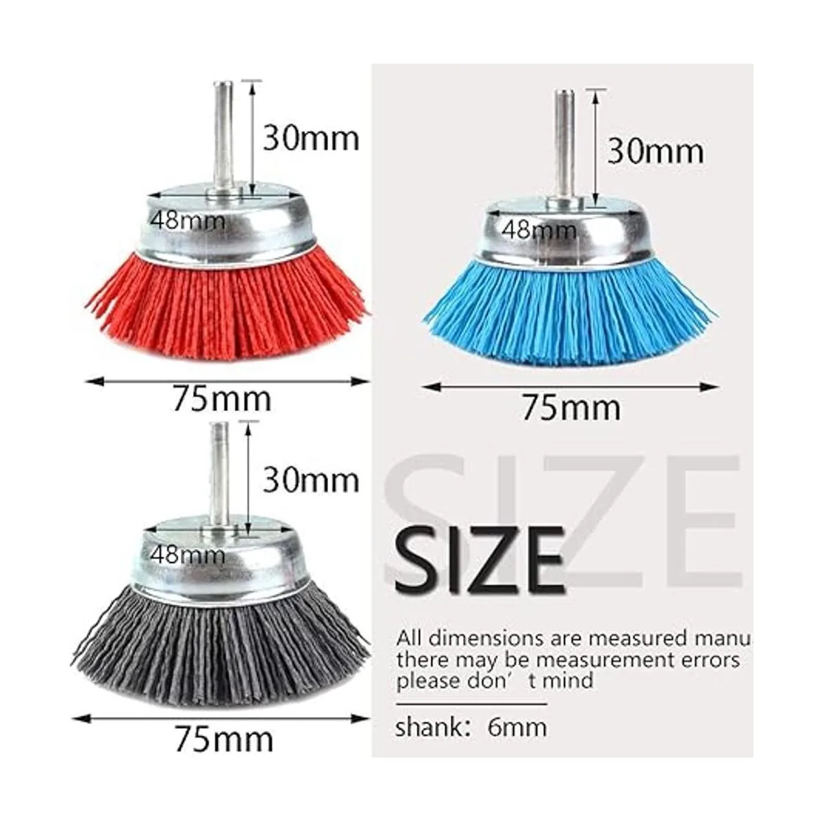 Diseño flexible: el juego de cepillos de nailon de 2.953 in incluye tres tamaños de grano, rojo grano 80 y gris grano 120 son adecuados para una gran área de molienda rápida; azul grano 240 adecuado para tratamiento de superficies más finas. Diferentes granos de estos cepillos abrasivos para satisfacer diferentes requisitos de molienda.