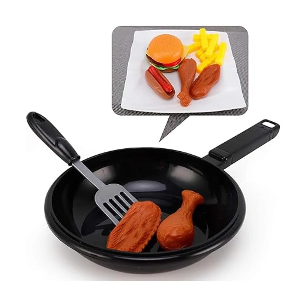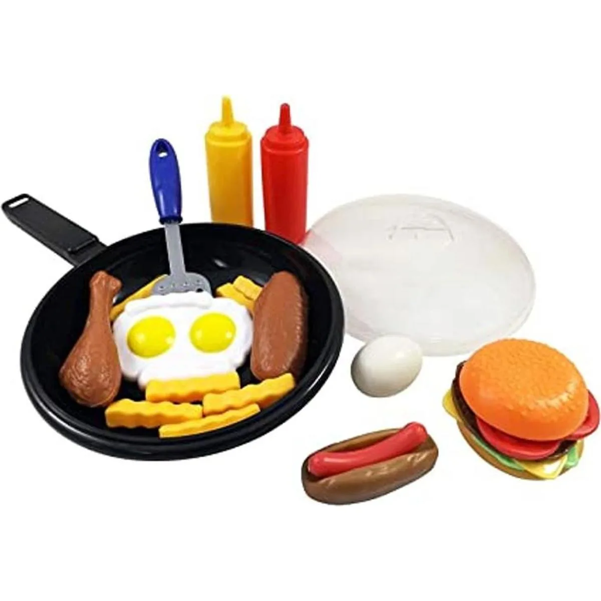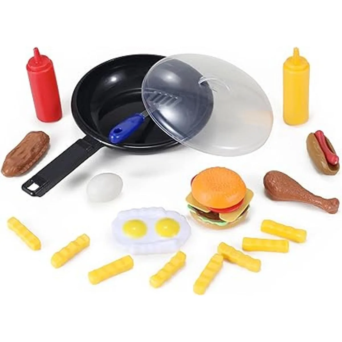 Surtido de comida rápida: el juego de 25 piezas de comida tiene una gran variedad de artículos, con utensilios una sartén de cocina, espátula, comida de juego hamburguesa de queso, perro caliente, ala de pollo y tambor, 8 patatas fritas y huevos, ala de pollo, y botellas de condimentos ketchup, mostaza. Todo lo que tu pequeño necesita para jugar como el chef