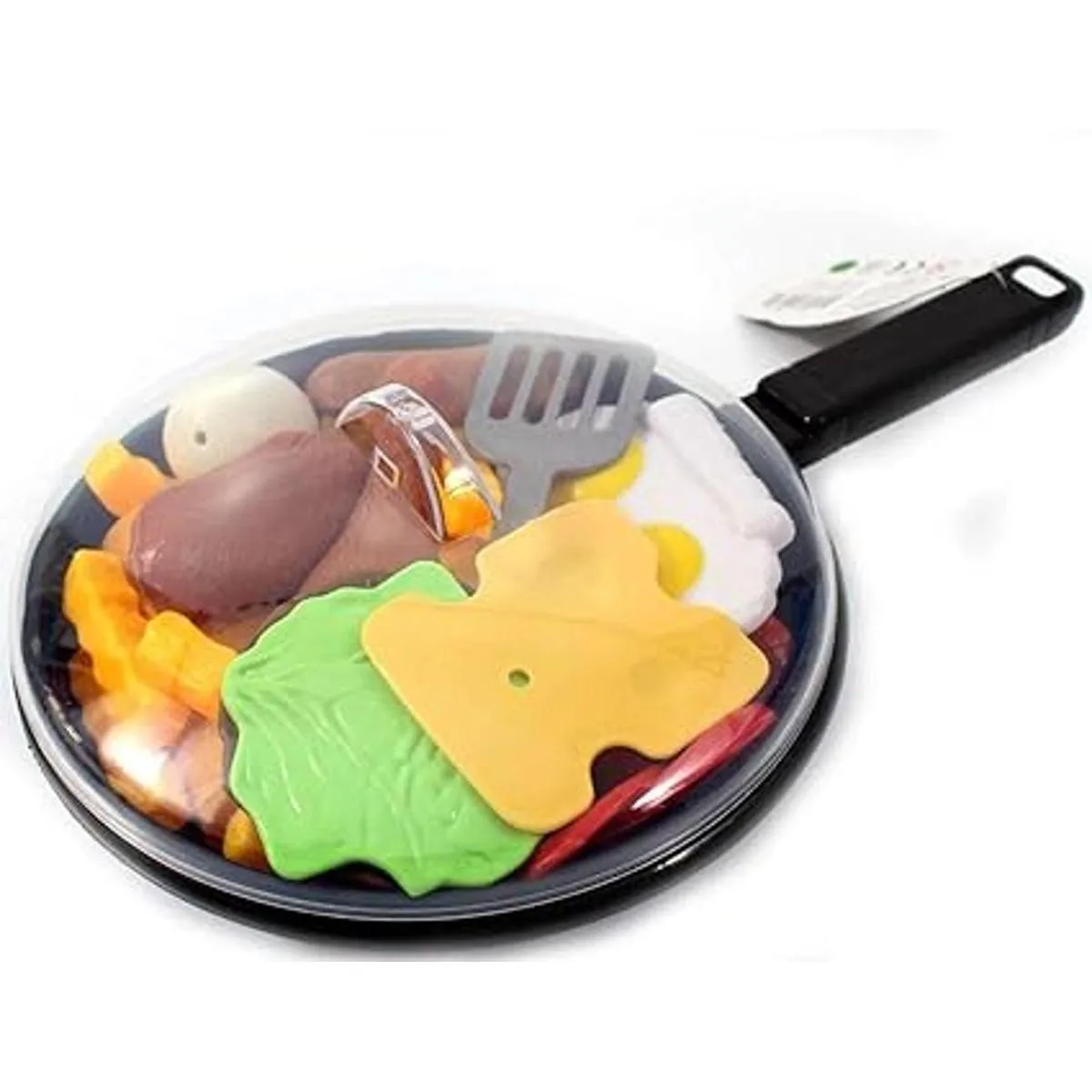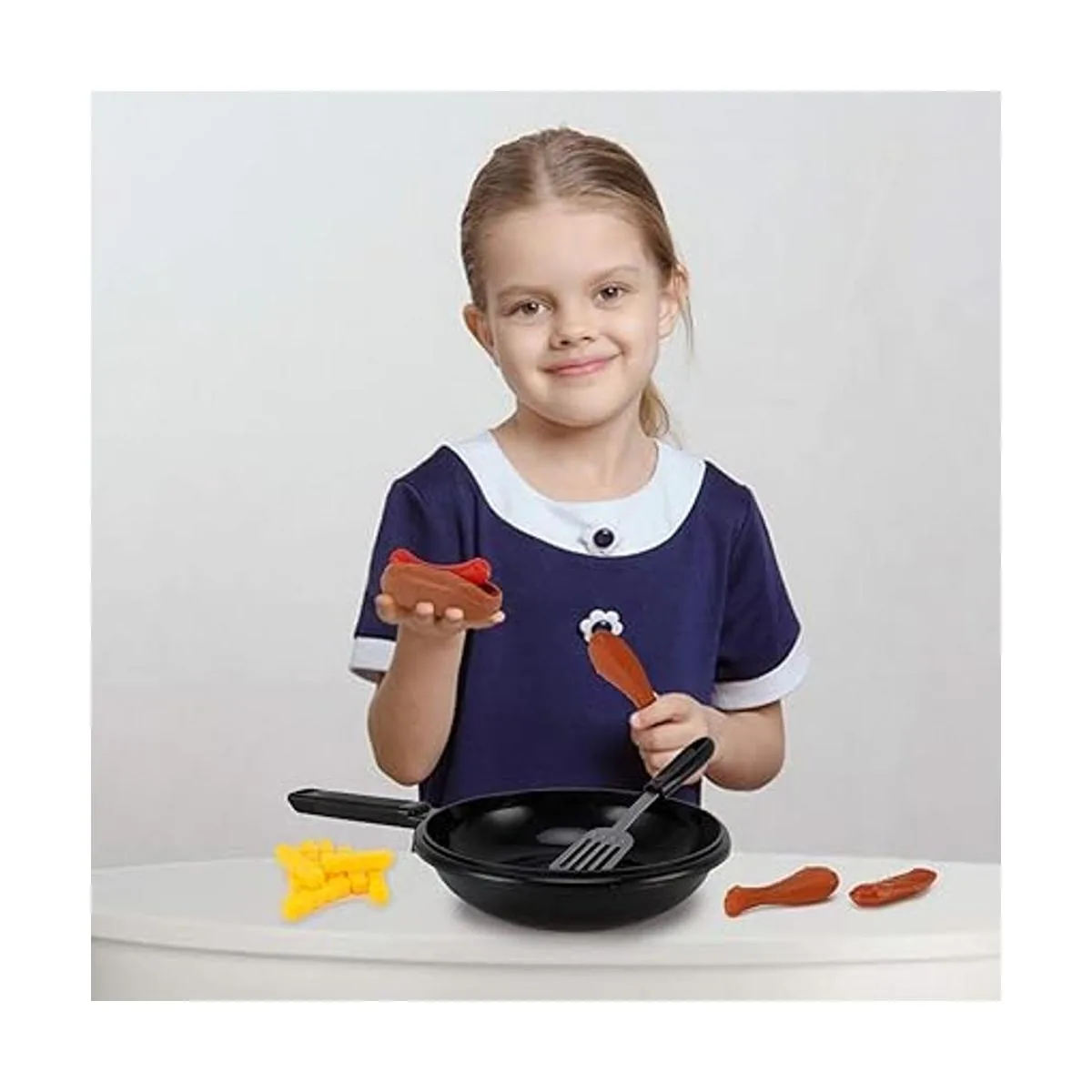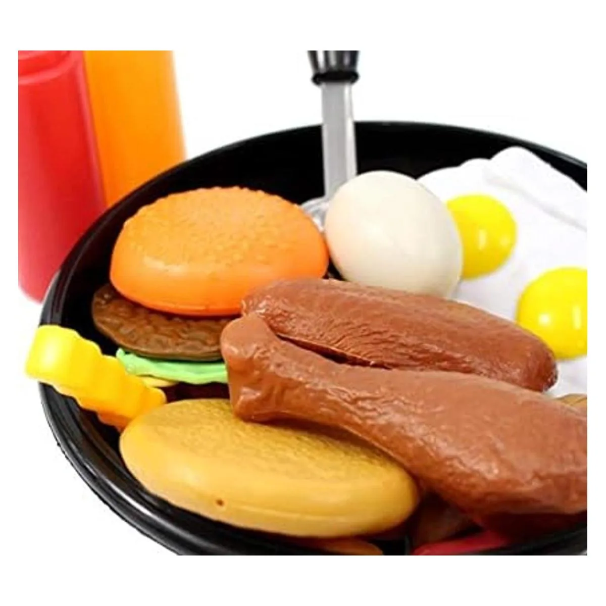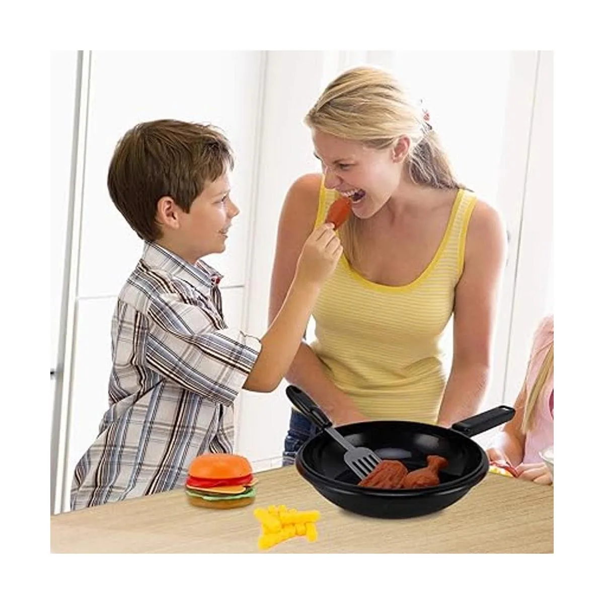 Surtido de comida rápida: el juego de 25 piezas de comida tiene una gran variedad de artículos, con utensilios una sartén de cocina, espátula, comida de juego hamburguesa de queso, perro caliente, ala de pollo y tambor, 8 patatas fritas y huevos, ala de pollo, y botellas de condimentos ketchup, mostaza. Todo lo que tu pequeño necesita para jugar como el chef