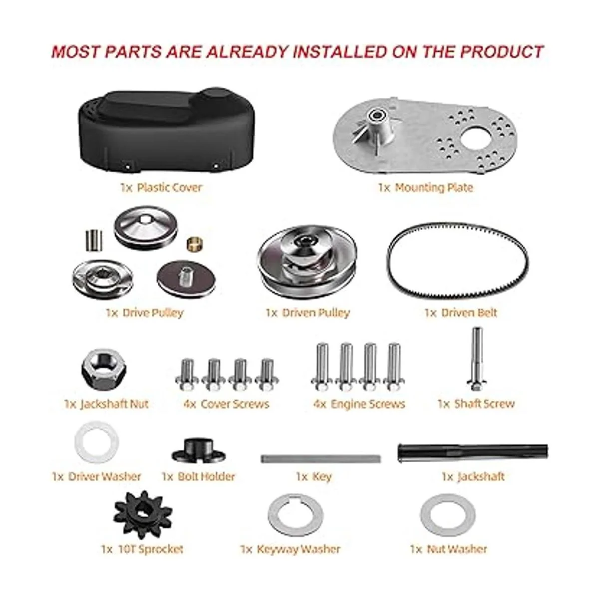 El paquete incluye: 1 orificio de embrague de conductor de 3/4 pulgadas, 1 diámetro total de 6 pulgadas polea accionada de 5/8 pulgadas, 1 piñón de 10 dientes para cadena 40 41 420 cadena no incluida, 1 cinturón de transmisión, 1 cubierta de plástico, 1 kit de herramientas de montaje completo, 1 placa de aluminio. Como se muestra en las imágenes