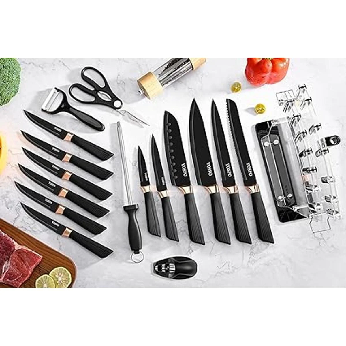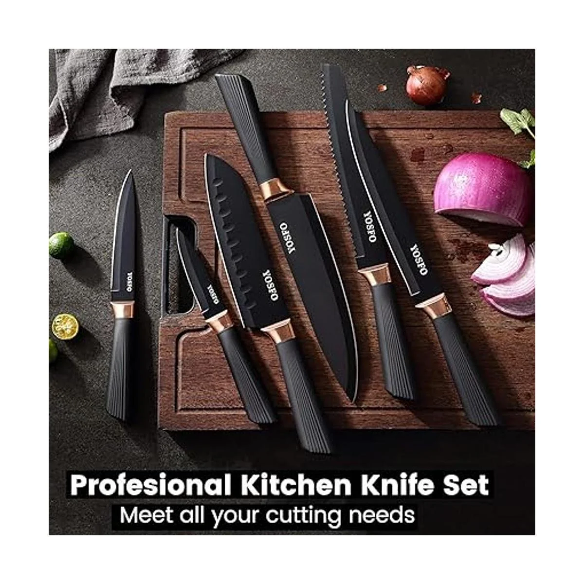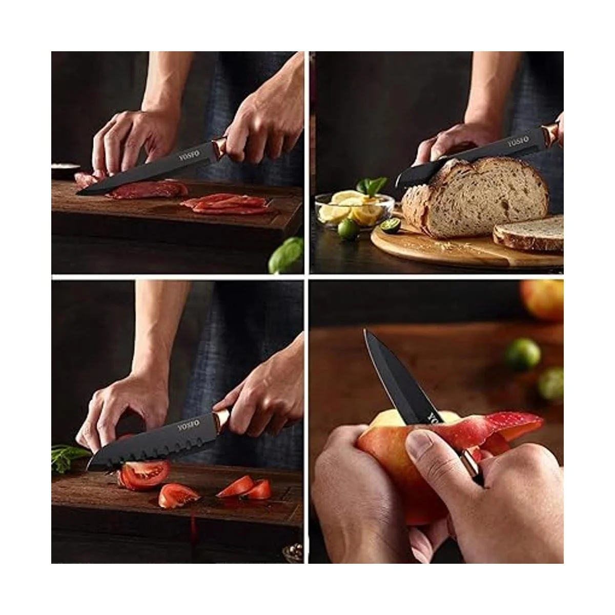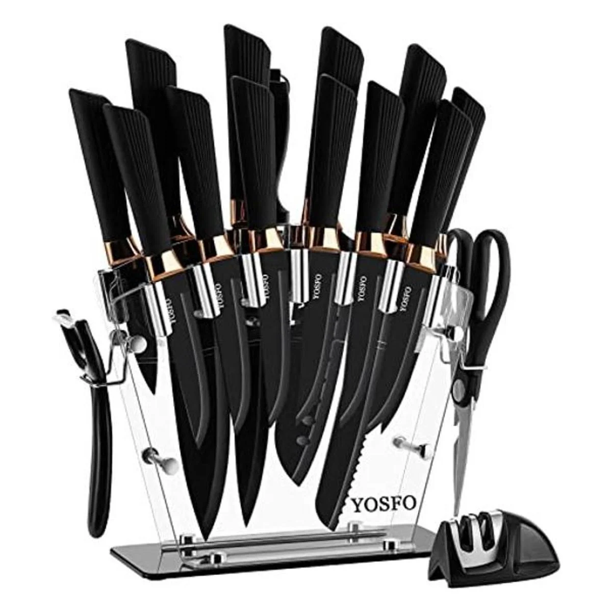 Juego de cuchillos de 17 piezas: el juego de cuchillos de cocina YOSFO ESSENTIAL satisface todas tus necesidades para cortar cosas en la cocina, que incluye: chef de 8 pulgadas, pan de 8 pulgadas, tallado de 8 pulgadas, Santoku de 7 pulgadas, acero de cuerno de 7.5 pulgadas, utilidad de 5 pulgadas, pelar de 3.5 pulgadas, juego de cuchillos de carne de 6 x 4.7 pulgadas, así como tijeras, pelador, sacapuntas y soporte acrílico.