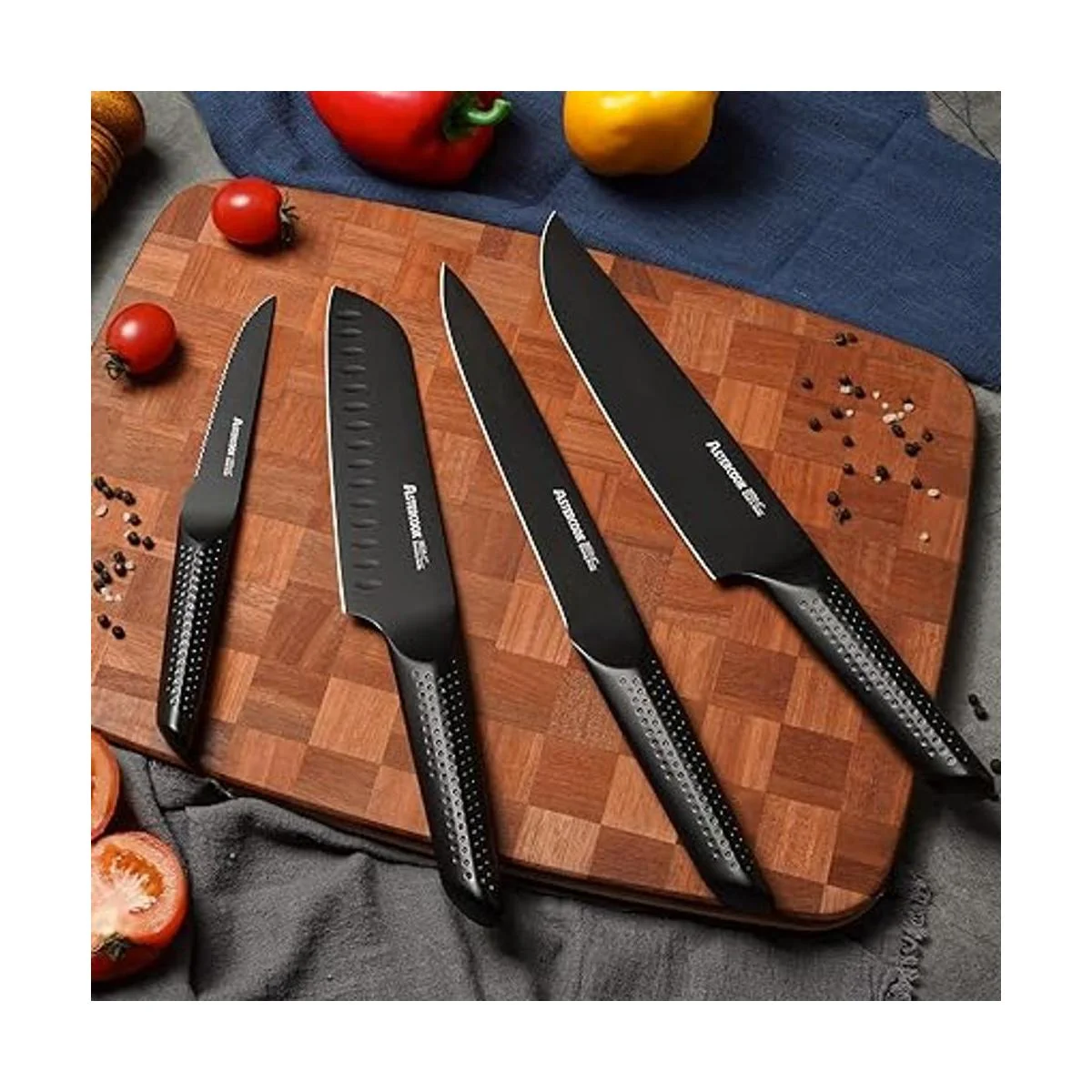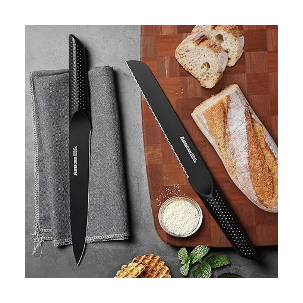 Juego de cuchillos todo en uno: el juego de cuchillos de 15 piezas incluye: cuchillo de chef de 8 pulgadas, cuchillo de rebanar de 8 pulgadas, cuchillo Santoku de 7 pulgadas, cuchillo de pan dentado de 8 pulgadas, cuchillo utilitario de 5 pulgadas, cuchillo de pelar de 3.5 pulgadas, 6 cuchillos dentados de 4.5 pulgadas, 1 tijeras de cocina, afilador y bloque de cuchillos de madera dura negra.