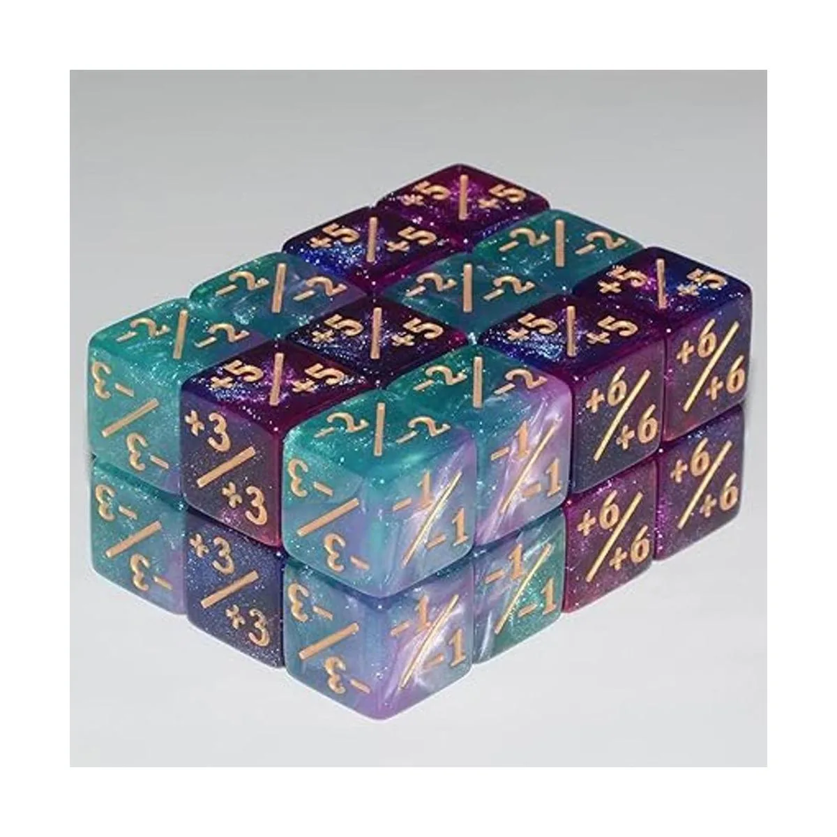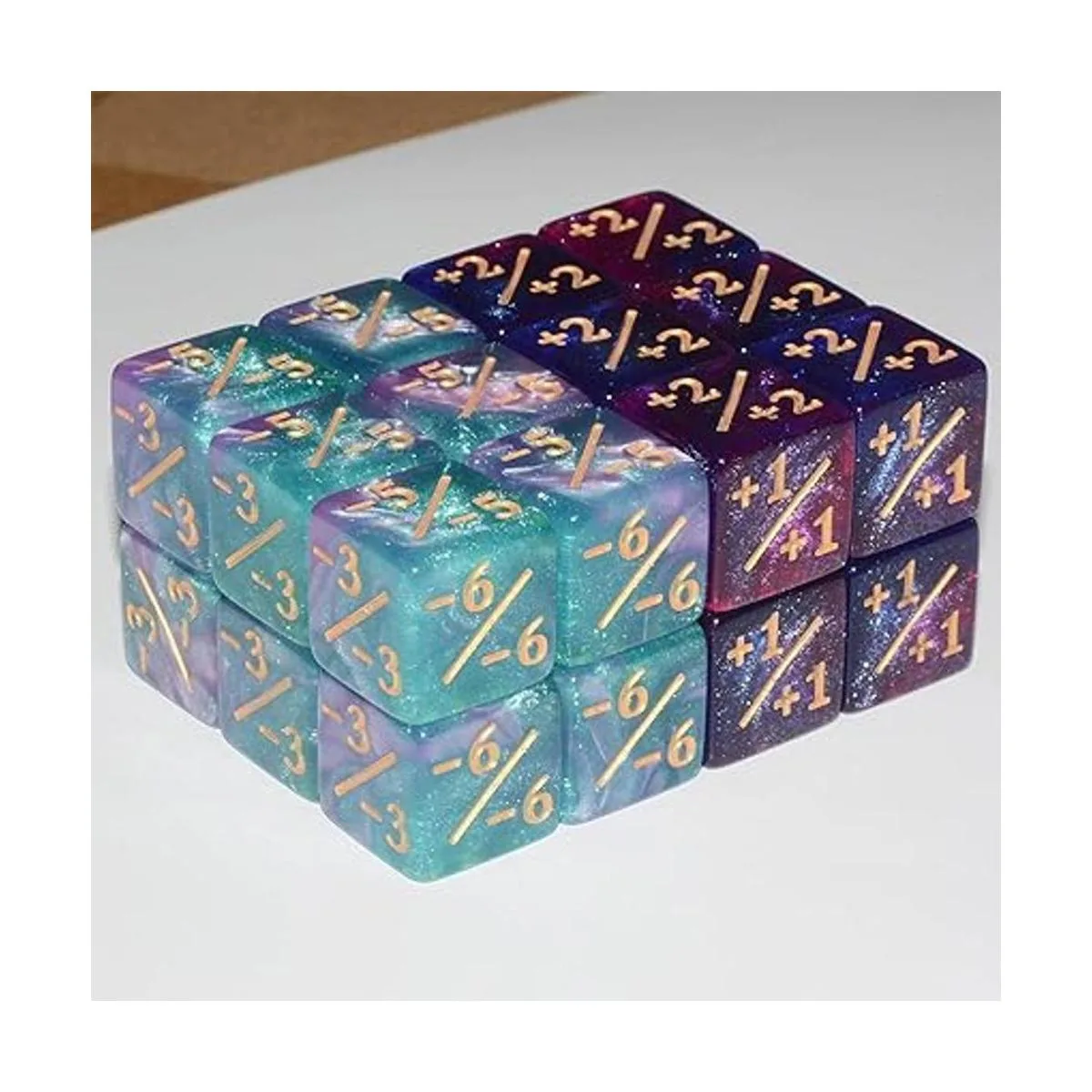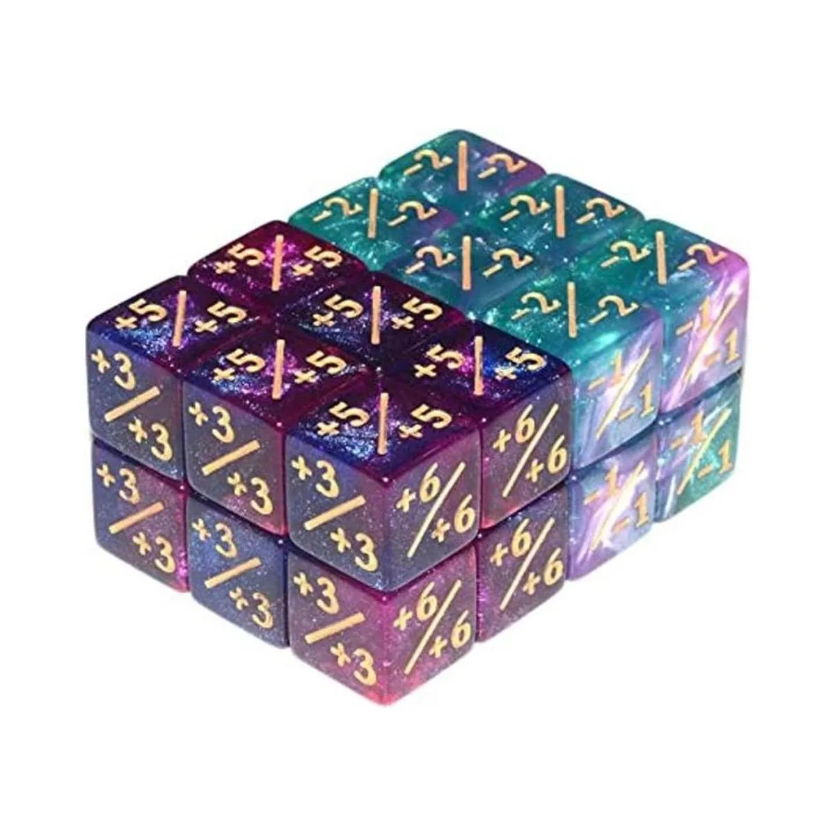 1. 24 dados MTG de 6 caras, incluyendo 12 contadores de dados positivos de color morado y azul y 12 contadores de dados negativos de color morado y verde.