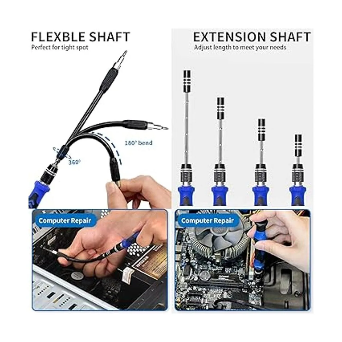 Diseño humanizado: este kit de destornillador de computadora, el mango del destornillador adopta un diseño tipo empuje. La goma suave es antideslizante y aumenta el par de torsión. La cabeza tiene un fuerte imán integrado y es estable. El diseño giratorio de 360 en la parte trasera del mango, sin deslizamiento, se puede operar con una sola mano. La barra de extensión se puede extender en 5 secciones y la longitud es de 2.953 in, la barra de extensión de suavidad puede girar 360 y doblarse 180. Puede ayudarte a lidiar fácilmente con un complejo entorno de desmontaje.