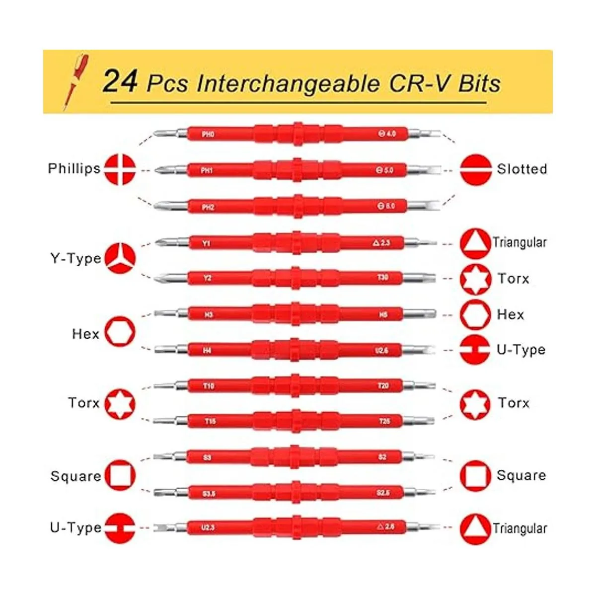 24 en 1 y multifuncional: este juego de destornilladores magnéticos incluye 1 bolígrafo de probador eléctrico, 1 mango antideslizante y 12 cuchillas intercambiables con 24 puntas: 3 Phillips, 3 ranurados, 5 trox, 3 hex, 4 cuadrados, 2 tipo U, 2 triangulares. Están diseñados para apretar y aflojar fácilmente muchos tipos de tornillos. Se pueden utilizar para fijar la mayoría de tus productos domésticos como muebles de aire, lavadora, refrigerador, etc.