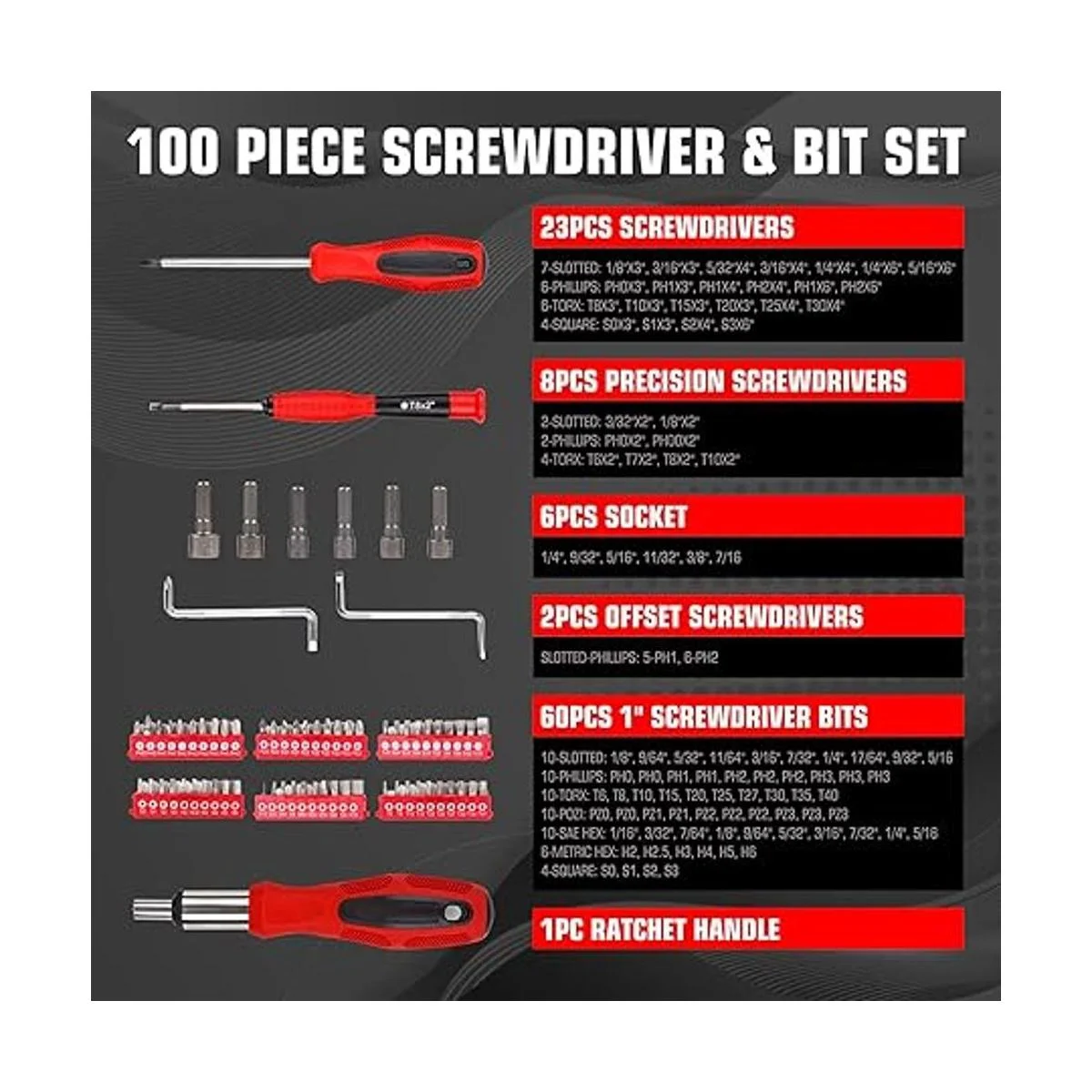 El juego contiene 23 destornilladores estándar, 8 destornilladores de precisión, 60 puntas de destornillador de 1 pulgada, 6 enchufes, 2 destornilladores compensados, 1 mango de trinquete. Juego todo en uno para uso universal y amplio como montaje para electrodomésticos básicos, muebles, automóviles, bicicletas, etc.