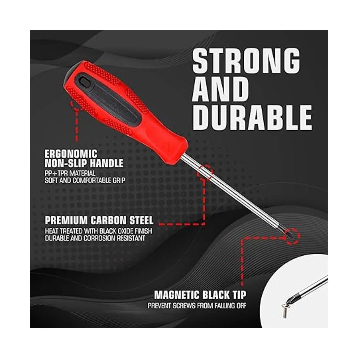 Fuerte punta magnética que atrae los tornillos fácilmente y hace que sea fácil sacar el tornillo después de desenredar. La punta magnética con revestimiento negro mejora el manejo y la manipulación de los tornillos.